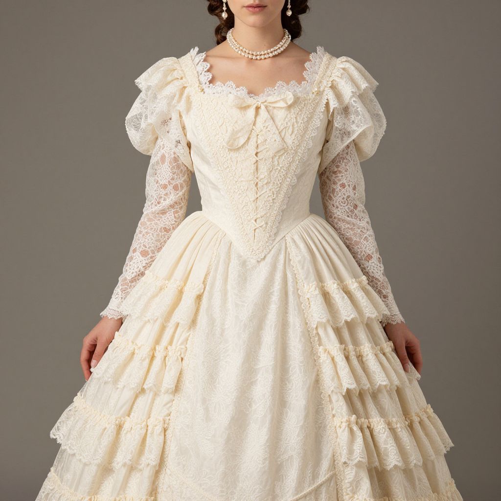 Elegant Victorian gown featuring cream-colored fabric with intricate lace detailing, puffed sleeves, and tiered ruffled layers, worn by a woman with styled hair and pearl accessories against a neutral backdrop.