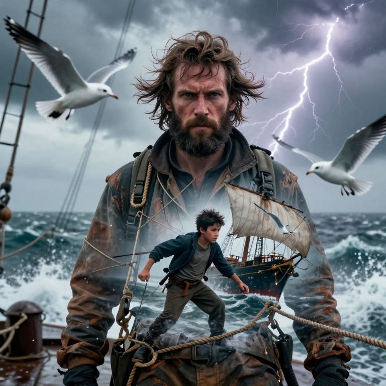 Craft an impactful double exposure portrait of a weathered shipwreck explorer, his rugged features intensified by a fierce gaze and windswept hair and beard. Positioned against a stormy sea backdrop, he stands resolute on the deck amidst a raging squall. Overlaying this scene is an intricate web of ropes, sails, and soaring seagulls that seamlessly merge with the form of a determined boy, exuding movement and dynamism. The interplay between his expression and the chaotic environment conveys a narrative of resilience and courage, enhanced by dramatic lightning flashes and deep shadows.