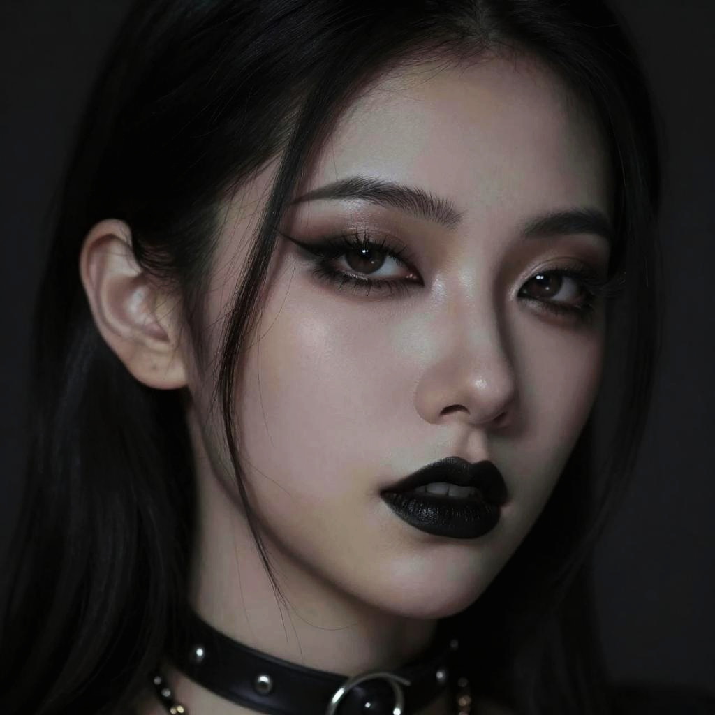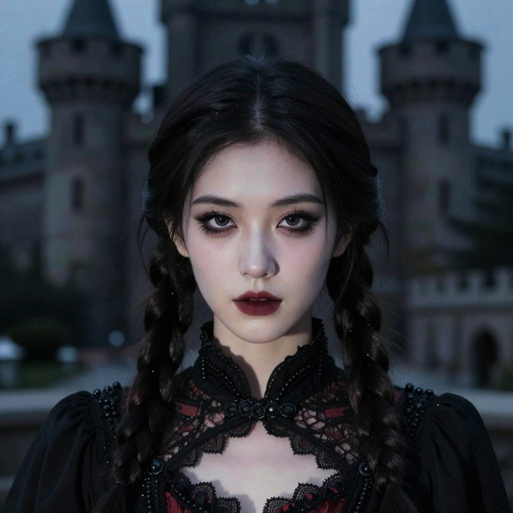 Closeup of (ohwx woman) wearing gothic clothes, braided pigtails, in a castle, sharp focus, looking at the camera, makeup, cinematic look, night time, Mystical atmosphere