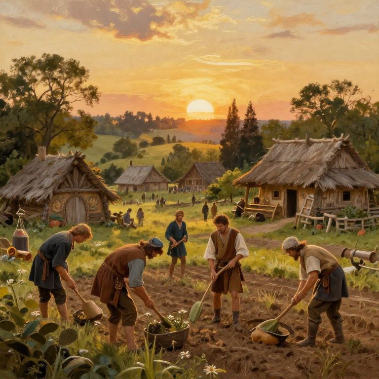 Fantasy peasant art depicting a rustic village scene with humble peasants working the fields under a golden sunset, detailed medieval clothing, intricate huts, lush greenery, and soft, painterly brush strokes in a warm color palette.