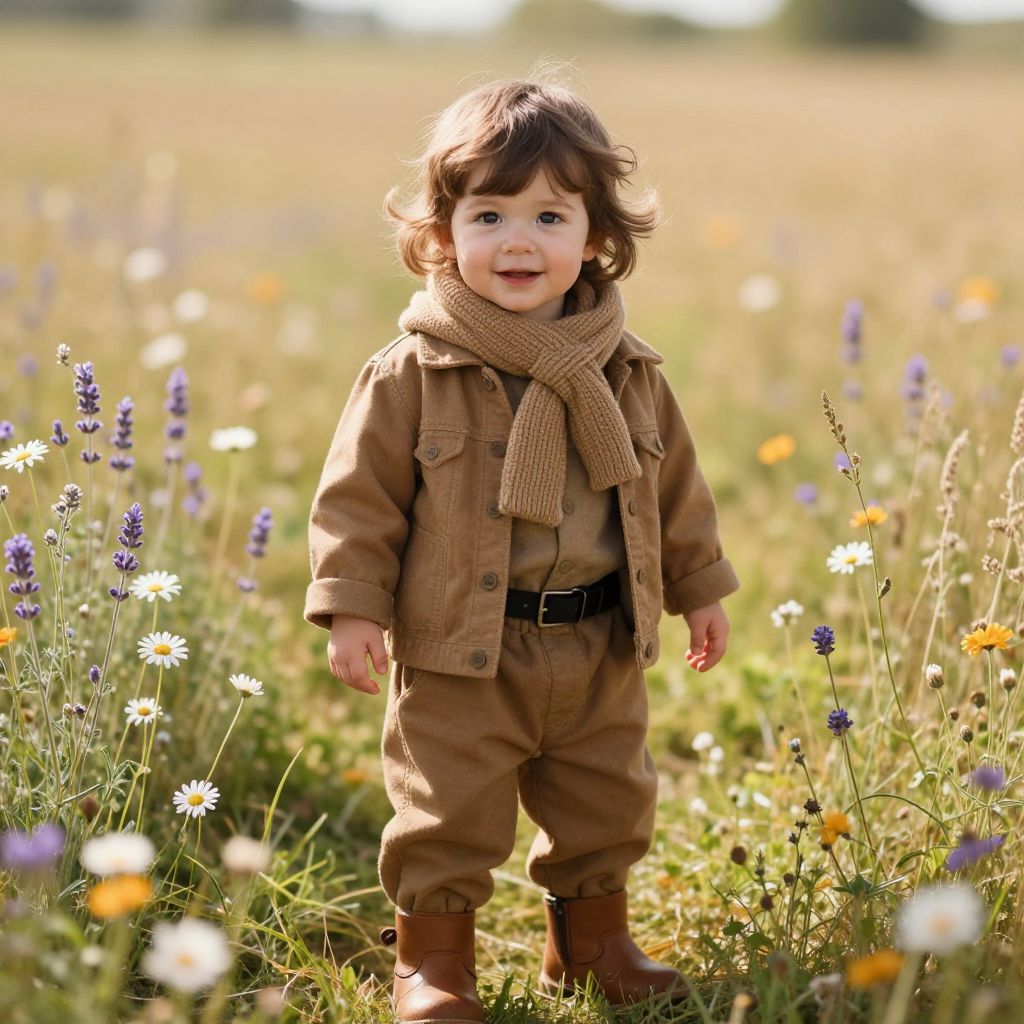 A young child with warm brown hair, soft curls gently framing their face, wearing a cozy brown outfit that includes a warm brown jacket, comfortable brown pants, and a matching knit scarf, paired with a black belt and sturdy brown boots. The child is standing in a sunny meadow filled with soft, golden grass and vibrant blooming flowers—daisies, wildflowers, and lavender—draped in gentle sunlight. The child looks slightly curious and happy, with a gentle, wide smile and bright, expressive eyes that sparkle with innocence and wonder. The scene captures a moment of natural charm, warmth, and pure joy, evoking a sense of peace and childhood simplicity, with soft shadows and clear, crisp details that highlight the textures of the fabric, the grass, and the child's joyful presence.