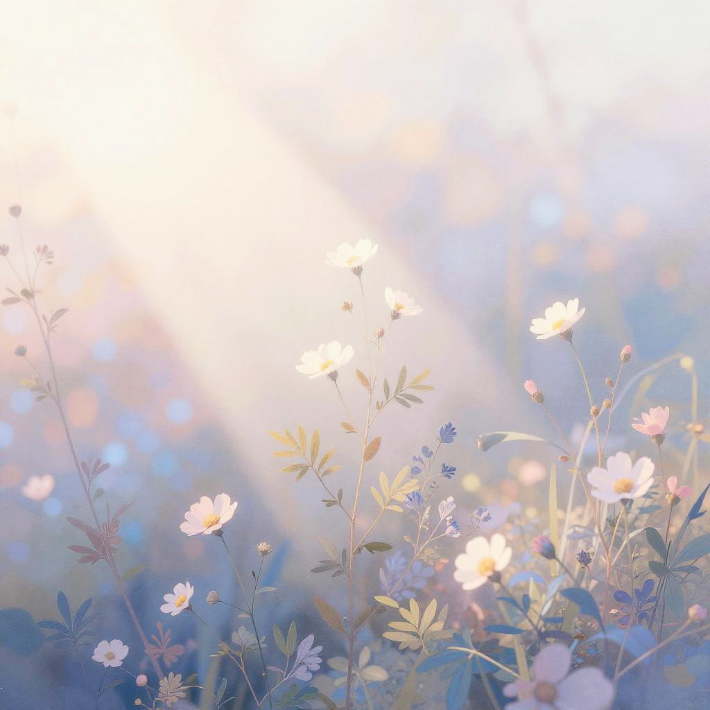 Wallpaper:q2l5pumjxfs= serene nature-inspired scene, soft pastel color palette, delicate blending of flora and light rays, minimalistic yet detailed, peaceful and calming mood, realistic textures with subtle artistic touch, ideal for a calming screen background