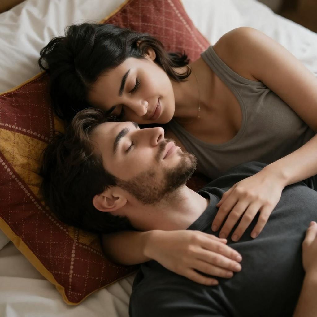 Photograph of a man and woman lying in bed under blue sheets. The man, with a beard and muscular build, lies on his back with his arm behind his head. The woman, with long brown hair, rests her head on his chest. They are partially illuminated by a bright light from the right, creating a shadowy background. The woman's arm is draped over the man's torso.