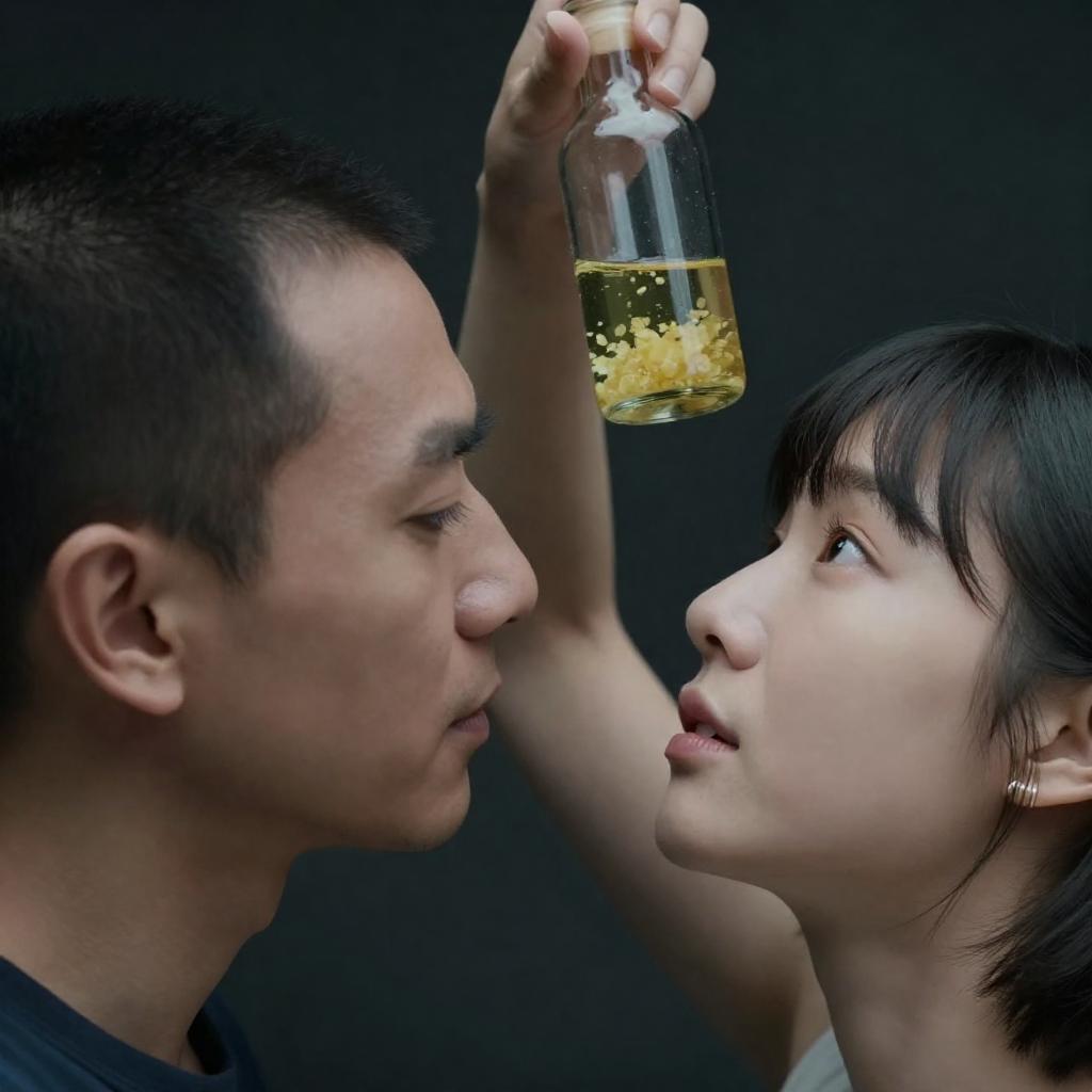 Photograph of a man and woman in close-up. Man with receding dark hair, light skin, side profile, looking at the woman. Woman with short black hair, light skin, looking up at a glass bottle held by a man's hand. Bottle contains yellow liquid and crystals. Dark background. Man's expression is focused, woman's expression is curious.