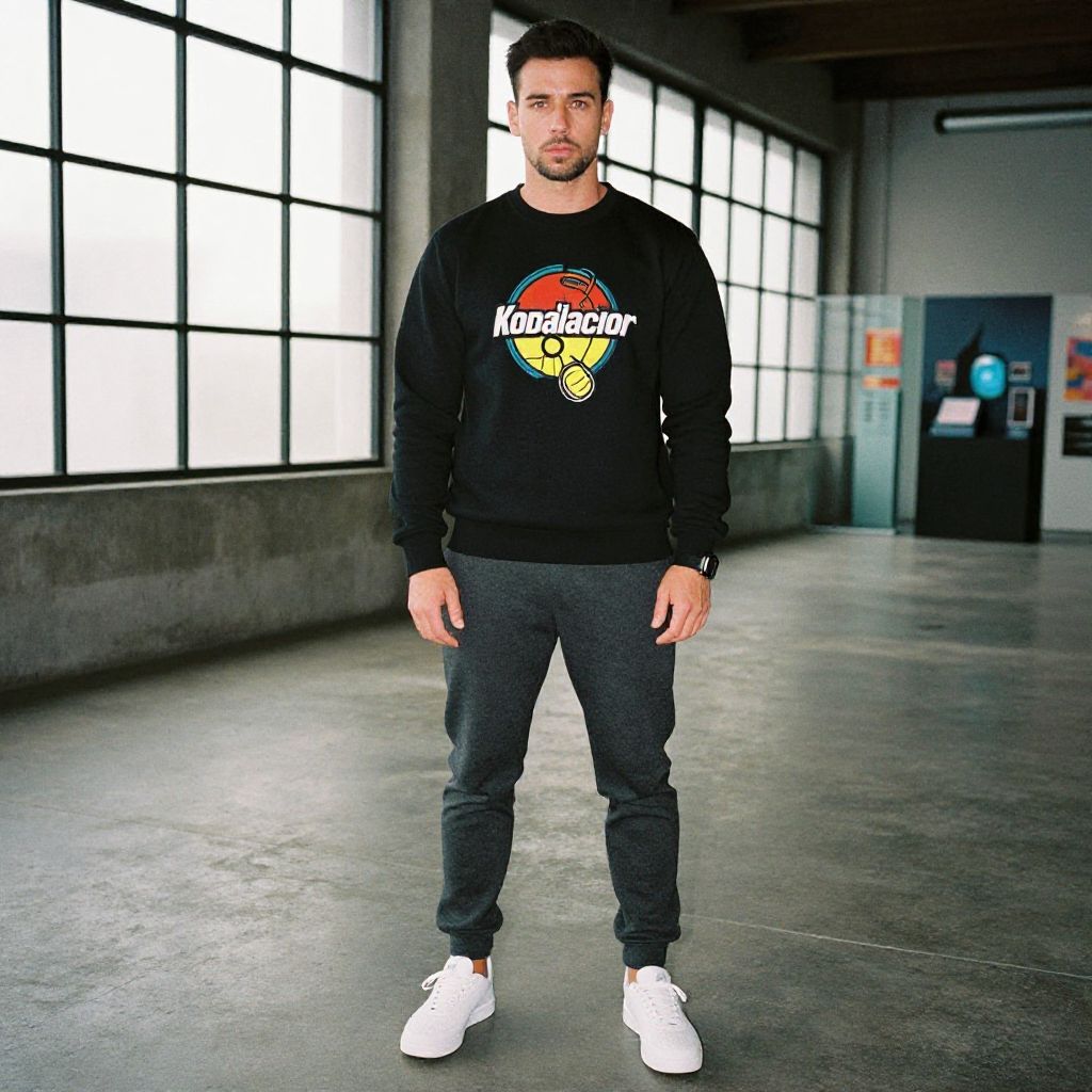 A man, graphic pullover in black cotton, vibrant logo print, slim-fit joggers in charcoal fleece, white sneakers, relaxed streetwear vibe, industrial concrete floors, large glass windows, interactive exhibits, kodacolor analog film, confident expression. Man has masculine face and piercing eyes