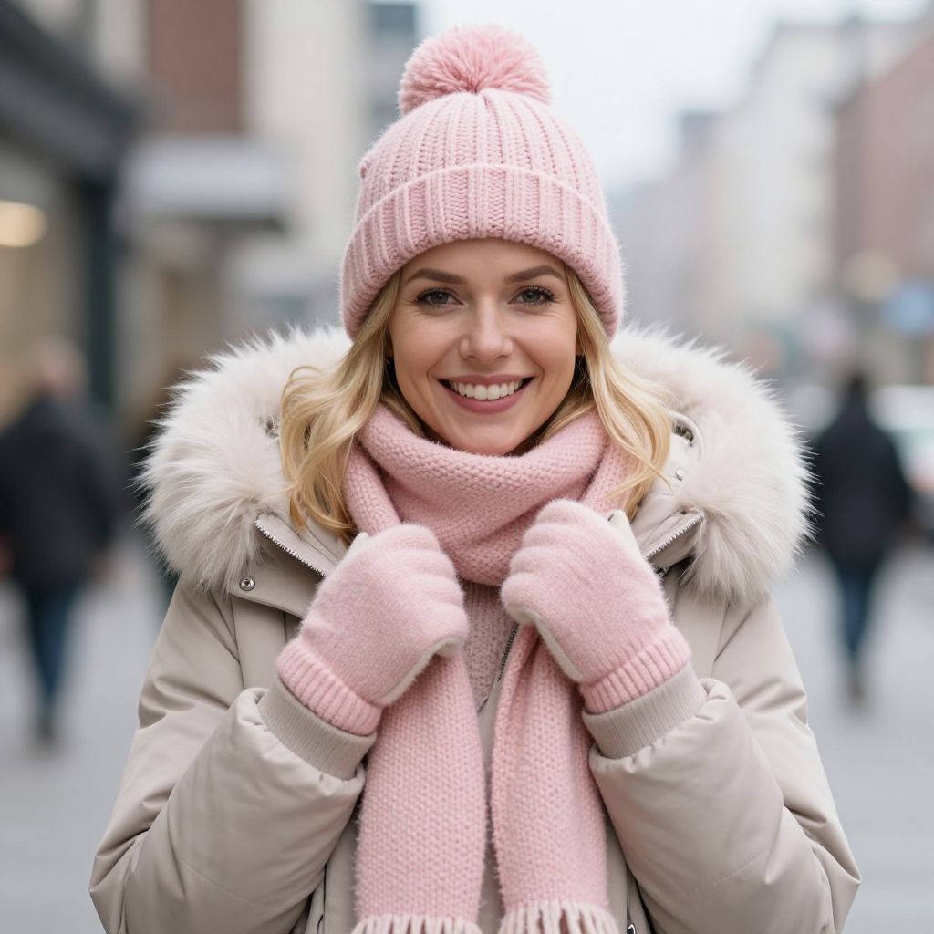 Blonde-haired woman radiating warmth and cheerfulness stands in the city, dressed in stylish winter attire including a cozy pink knit hat with a pom-pom, matching scarf, and mittens, complemented by a beige puffer jacket with a plush white fur-lined hood.