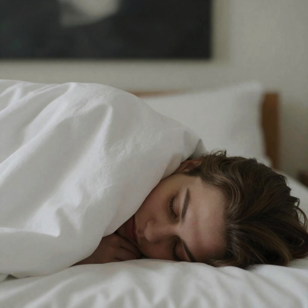Photograph of a woman with messy brown hair, wearing a teal shirt, lying on a bed with a colorful quilt and yellow blanket. She rests her head on her forearm, eyes closed, appearing asleep. Background includes a dimly lit room with a lamp and blurred objects.