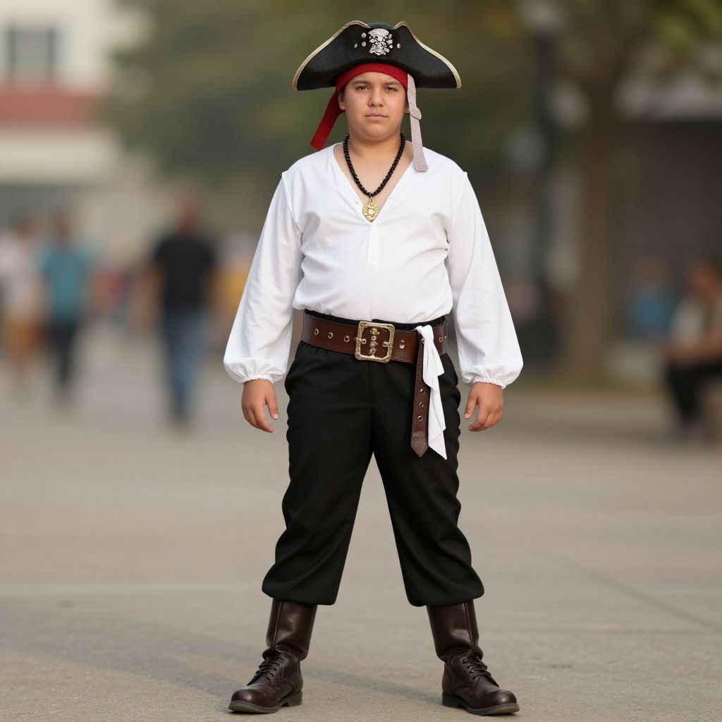 Pirate plus size costume, hat, boots, 1boy, male focus, belt, pants, blurry background, shirt, blurry, white shirt, standing, full body, outdoors, long sleeves, pirate hat, solo focus, black pants, necklace, brown footwear, brown belt, solo, jewelry