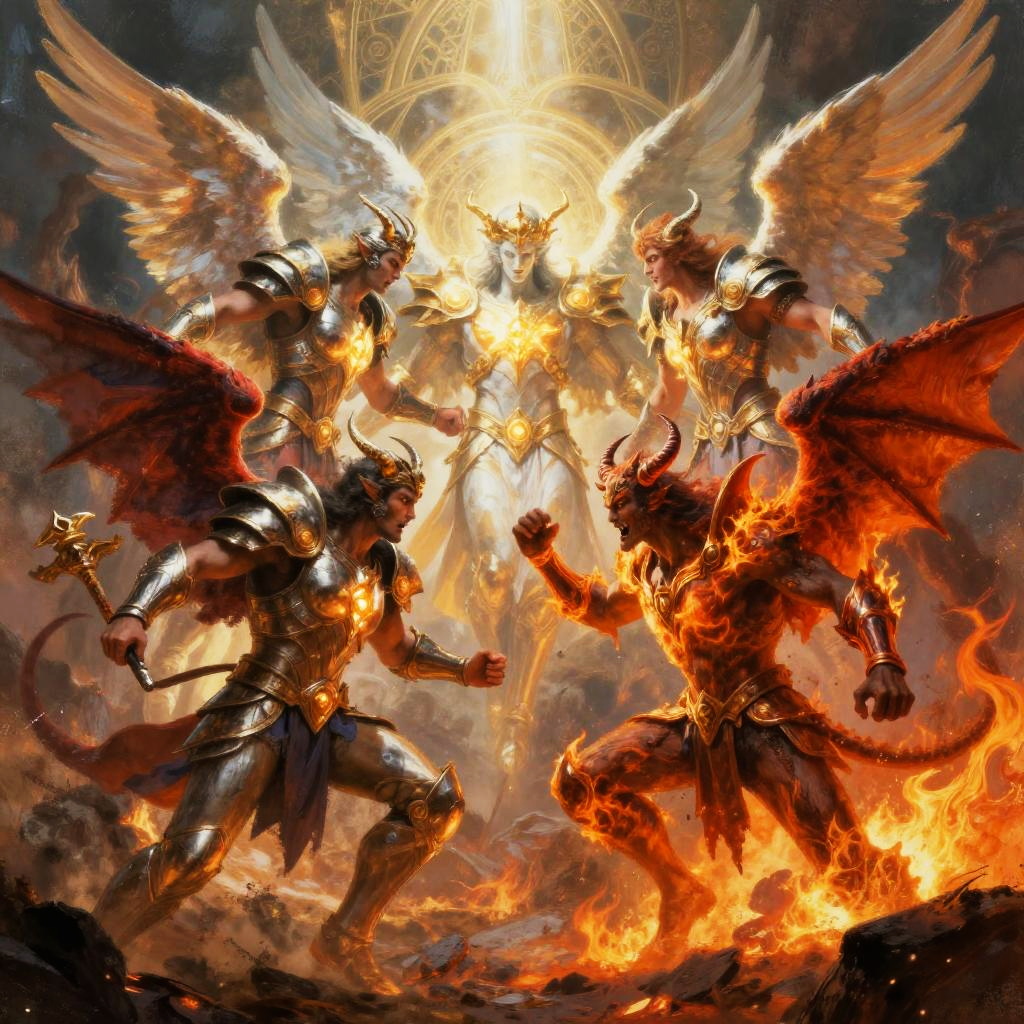 Angels vs demons battle art depicting a chaotic fight on a shattered battlefield, winged angels wielding swords of light against grotesque demons with dark, spiked armor, swirling smoke and flashes of magic, dark fantasy atmosphere.