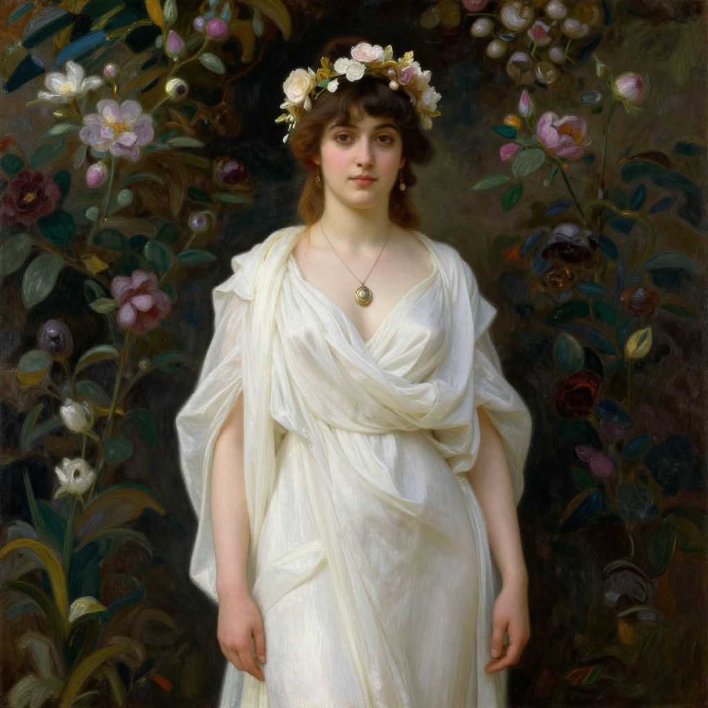 A classical oil painting reminiscent of Frederic Leighton's style, featuring a woman draped in a flowing white garment, adorned with a delicate floral headpiece and a pendant necklace, set against a lush, floral backdrop with dramatic lighting that highlights her serene expression and poised stance.