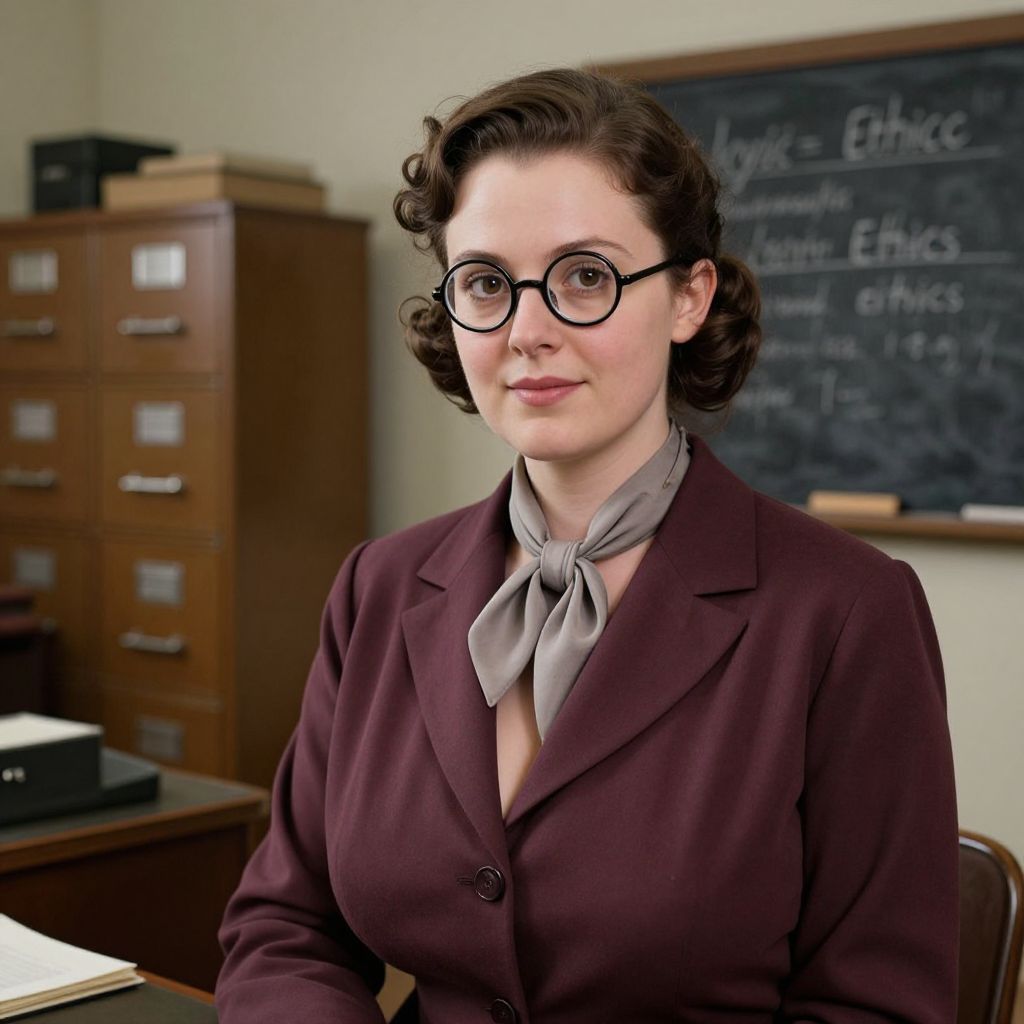 A sharply detailed photograph of a 1930s intellectual woman in a quiet, sophisticated costume—light burgundy suit with soft lapels and a neutral scarf tucked at her neck—wearing round glasses that enhance her intellectual demeanor. She has a composed face with warm brown eyes, pale skin, and a gentle smile that suggests deep understanding. The scene is a modest office with old filing cabinets, a vintage desk, and a chalkboard with writing about logic and ethics, evoking the spirit of early 20th-century female thinkers.. The woman has big tits and cute face