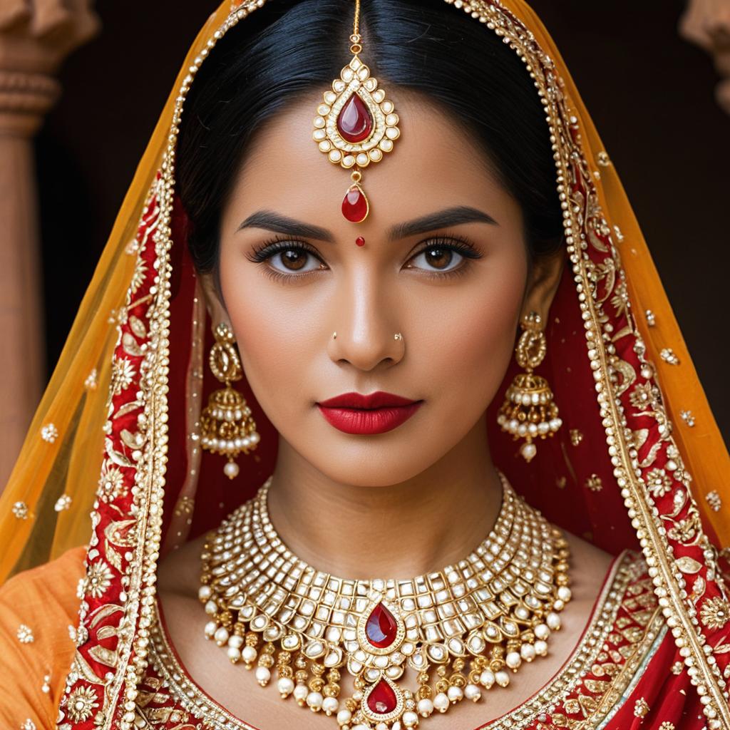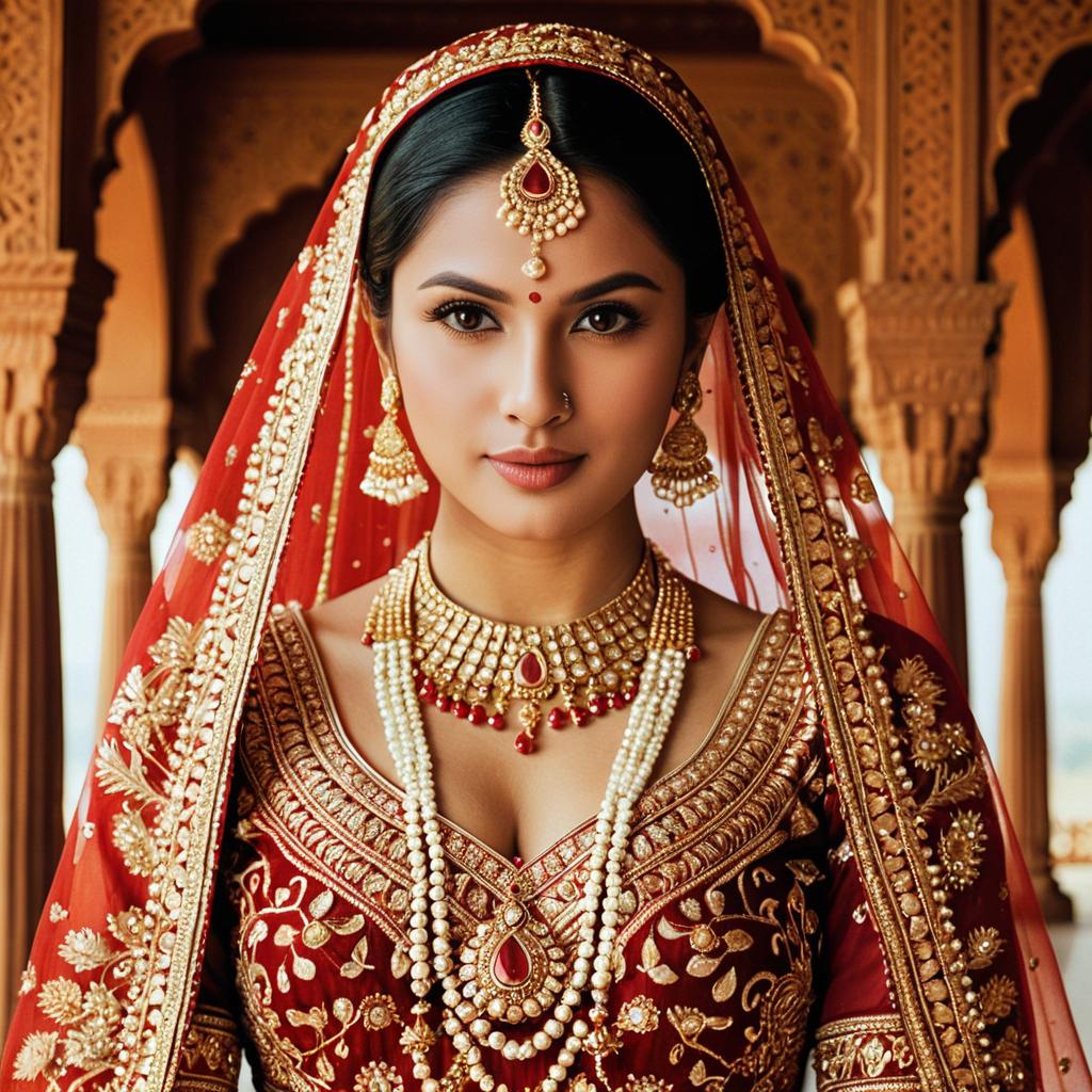 Portrait of an Indian bride wearing a traditional red and gold lehenga with intricate embroidery. She is adorned with ornate gold jewelry including a maang tikka, several necklaces, and elaborate jhumka earrings. The bride has a red veil with gold patterns draped over her head and wears classic bridal makeup with a confident expression. The background features classical Indian architecture with warm lighting enhancing the rich details of her cultural attire.