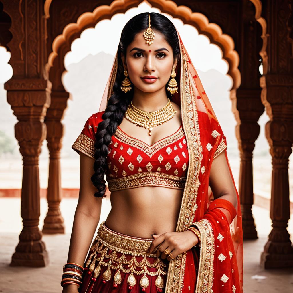 Rekha umrao jaan, photorealistic, Indian bride, standing, frontal view, traditional red and gold lehenga, detailed embroidery, long braid, red veil with gold patterns, ornate gold jewelry, maang tikka, necklace, earrings, elaborate jhumka earrings, classical Indian architecture background, soft sunlight, elegant, confident expression, detailed ures, warm colors, symmetrical composition, cultural attire, traditional dress, realistic lighting, ethnic fashion, high detail, realistic skin tone, medium shot, traditional Indian wedding attire, traditional jewelry, traditional beauty, cultural heritage.
