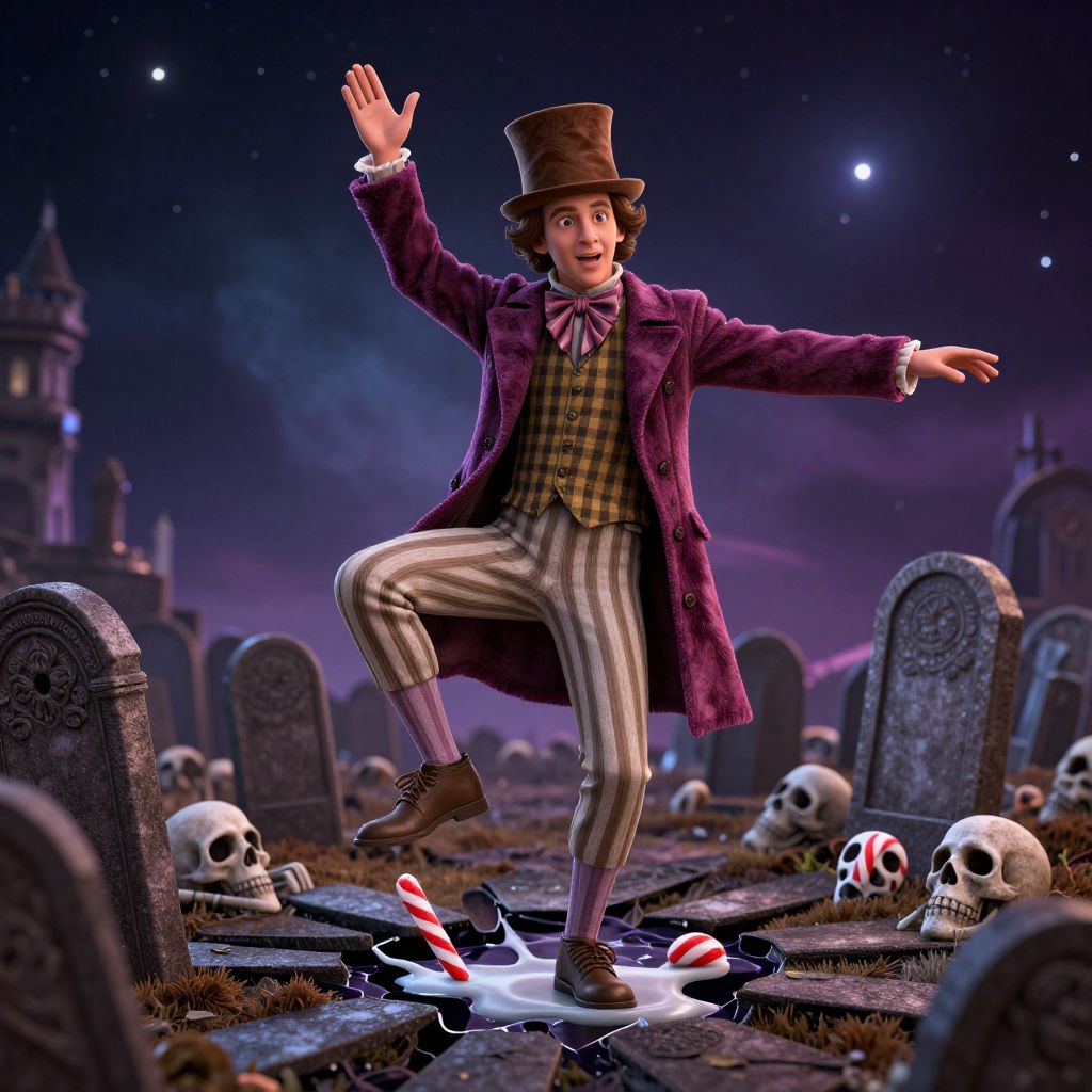 A photorealistic 3d rendering of a willy wonka's candy cane man dancing on the graves of lost souls seeping through the cracks of spacetime, starry sky, bokeh, highly detailed, atmospheric