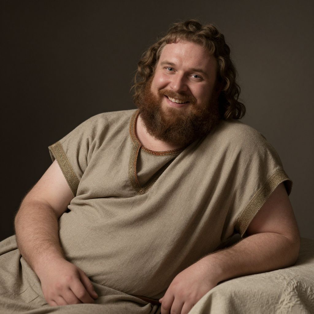 A brawny bearded man from antiquity with a kindly expression, relaxed after a difficult labour, character portrait by michael garmash, karol bak, greg rutkowski