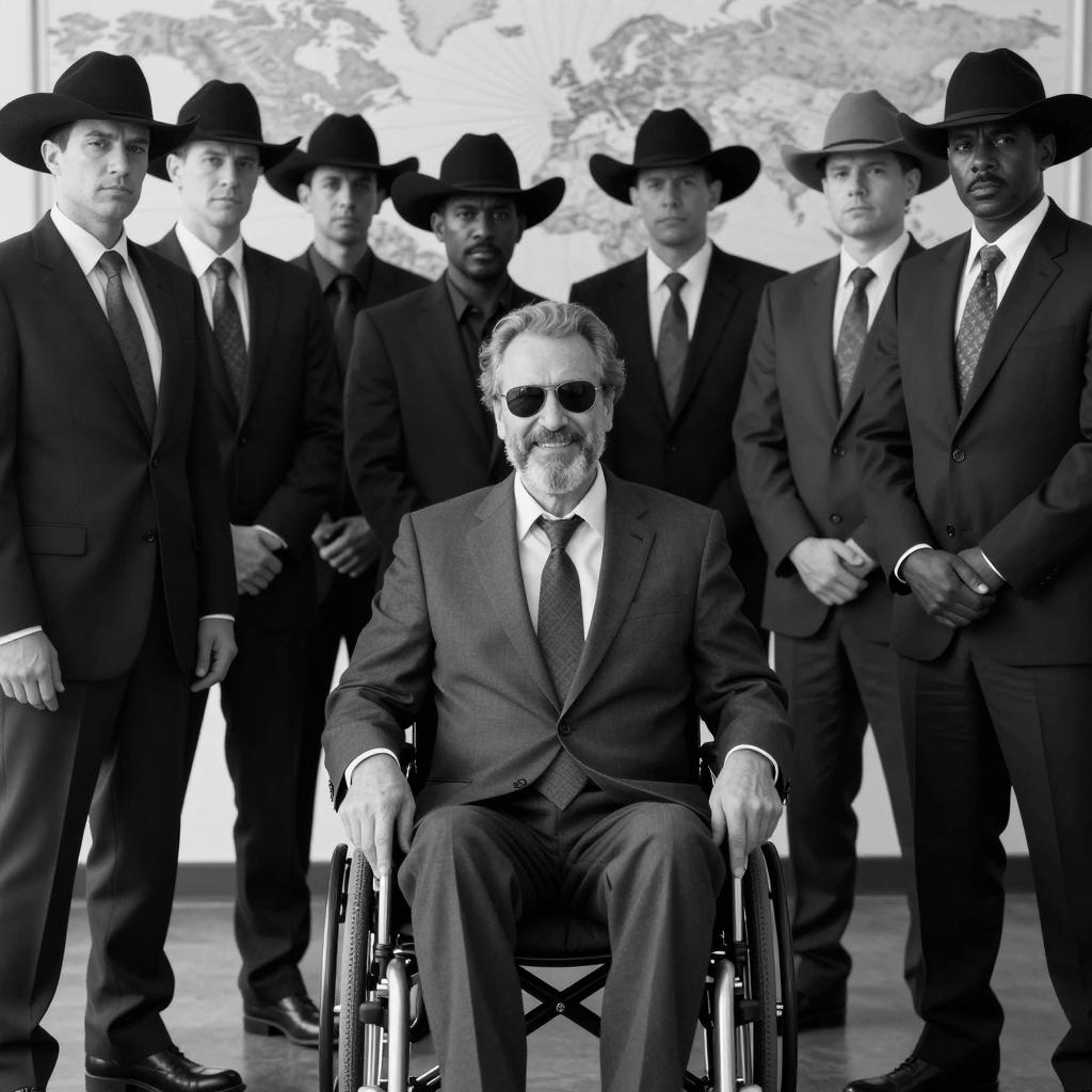 Black and white photograph of a middle-aged man with a beard and sunglasses, sitting in a wheelchair, smiling, surrounded by eight men in dark suits and hats. Background features a map of the world. Man in wheelchair has hands on wheelchair handles, wears a dark suit and tie. Several men in background have serious expressions, one wears a cowboy hat. Map has radial lines extending from the center.