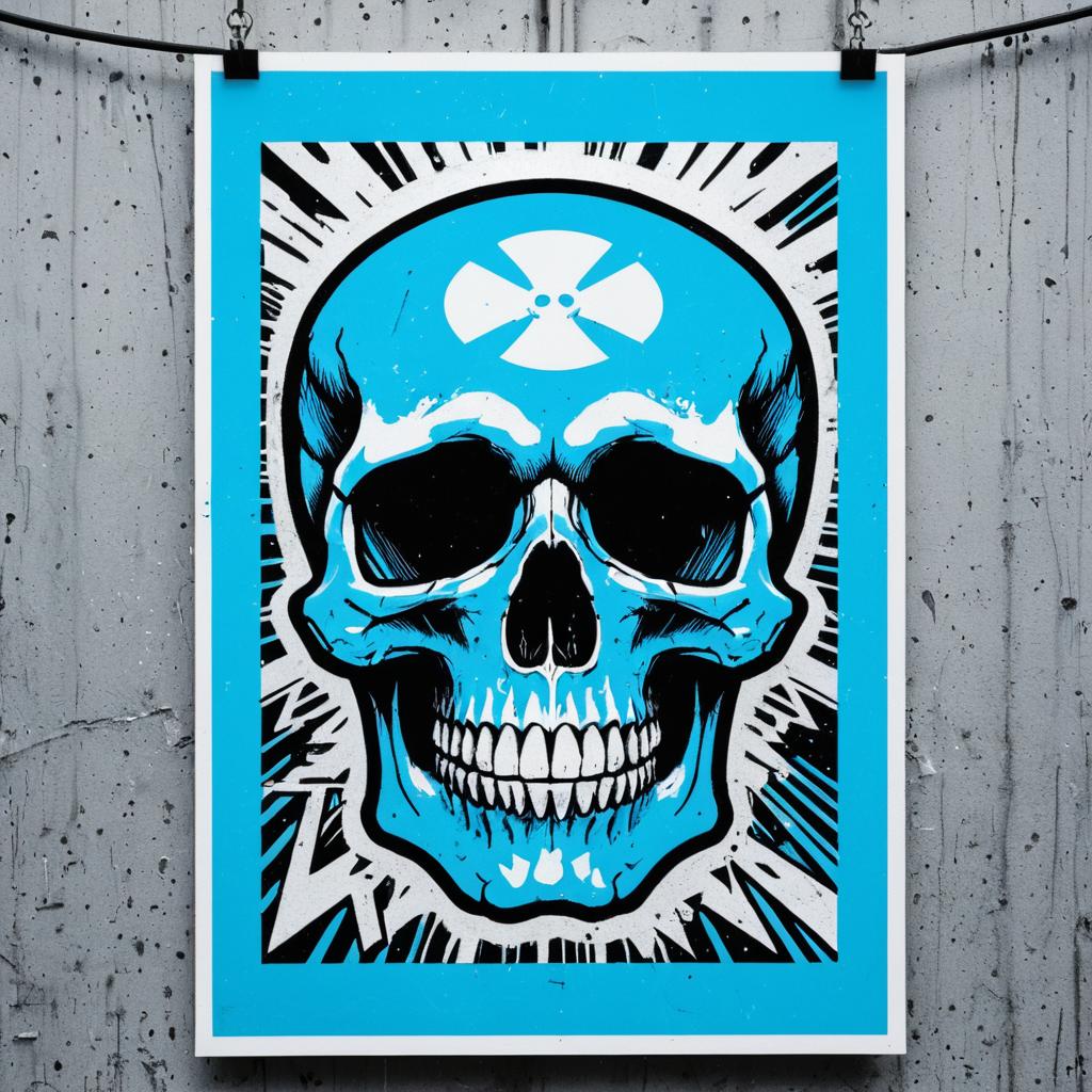 Acid house graffiti, poster with skull icon, fluorescent blue and silver