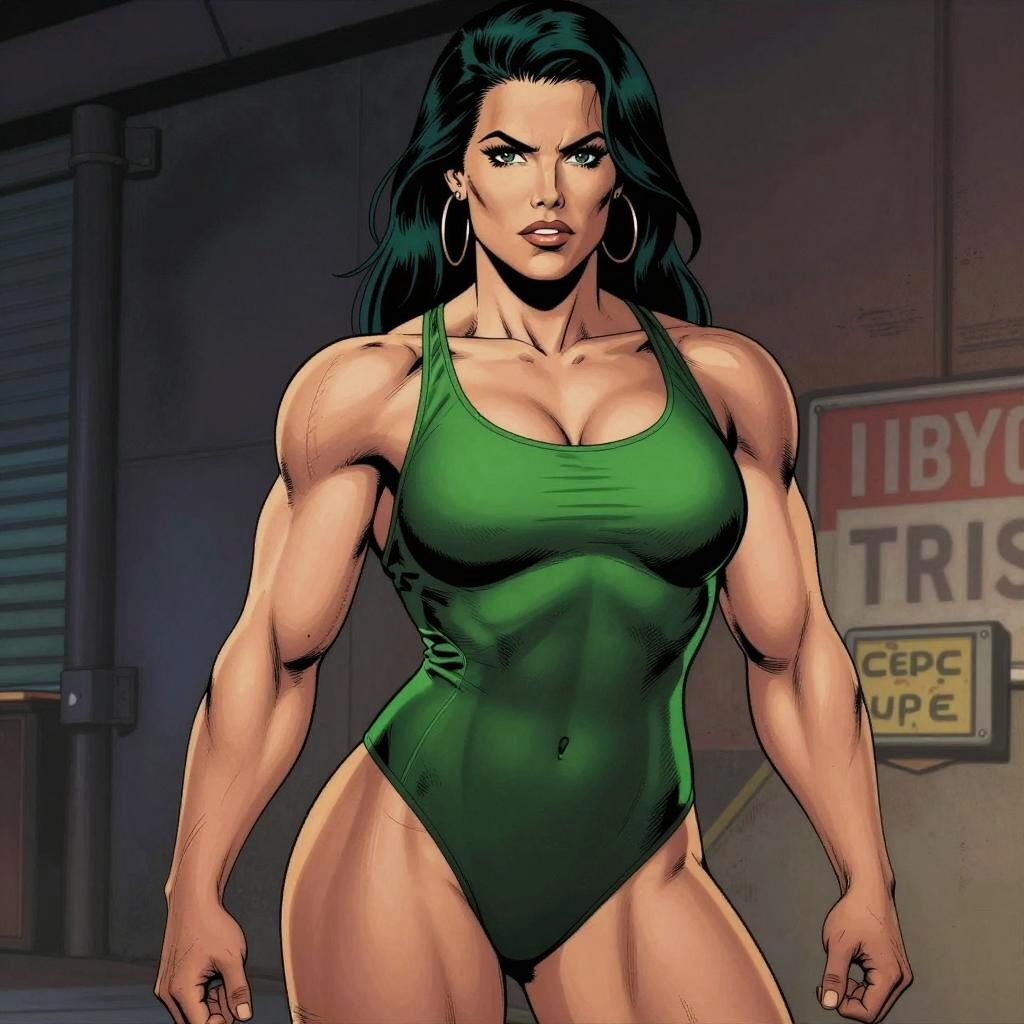 An artistically altered image of a muscular woman in a green swimsuit, showcasing a strong physique with enhanced size and definition in a industrial or urban setting. The style evokes comic book art, reminiscent of characters like She-Hulk.