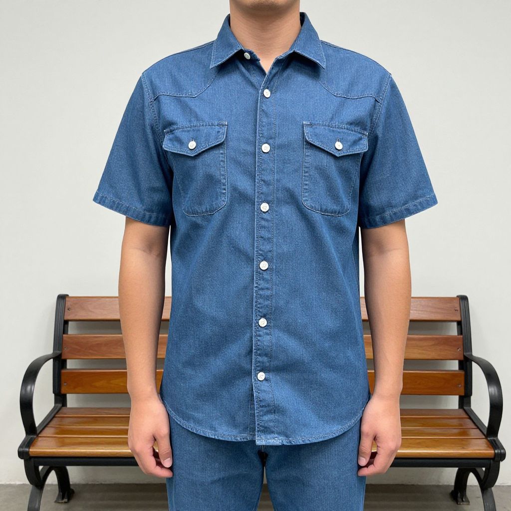 Photograph of a man from the waist up, wearing a short-sleeved, button-up, blue denim shirt with two chest pockets and white buttons. He also wears matching blue denim pants. The shirt has a slightly textured, woven fabric appearance. The man stands in front of a simple wooden bench with black metal armrests, against a plain white background. His face is not visible in the image. The lighting is bright and even, highlighting the textures and colors of the denim clothing. The overall style is casual and straightforward.