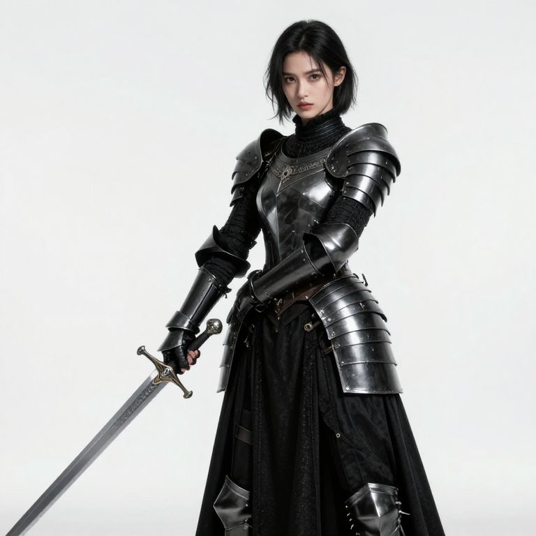 The image depicts a highly detailed Gothic female soldier, exuding an aura of strength and readiness. She is adorned in a combination of a black dress and plate armor, which seamlessly blend into a cohesive, dark ensemble. The armor is intricately designed, featuring a mix of sharp edges and ornate details, emphasizing a blend of functionality and aesthetics. Her black dress is form-fitting, accentuating her figure, and is complemented by a corset that adds to the overall silhouette. The soldier holds a sword with a long, curved blade and an ornate hilt, suggesting a weapon of significant importance. The background is a stark white, which contrasts sharply with the dark attire and armor, making the soldier the focal point of the image. The overall composition is balanced, with the soldier positioned centrally, and the sword held in a ready stance, indicating preparedness for battle. The interplay of light and shadow on the armor and dress adds depth and texture, enhancing the realism of the scene.