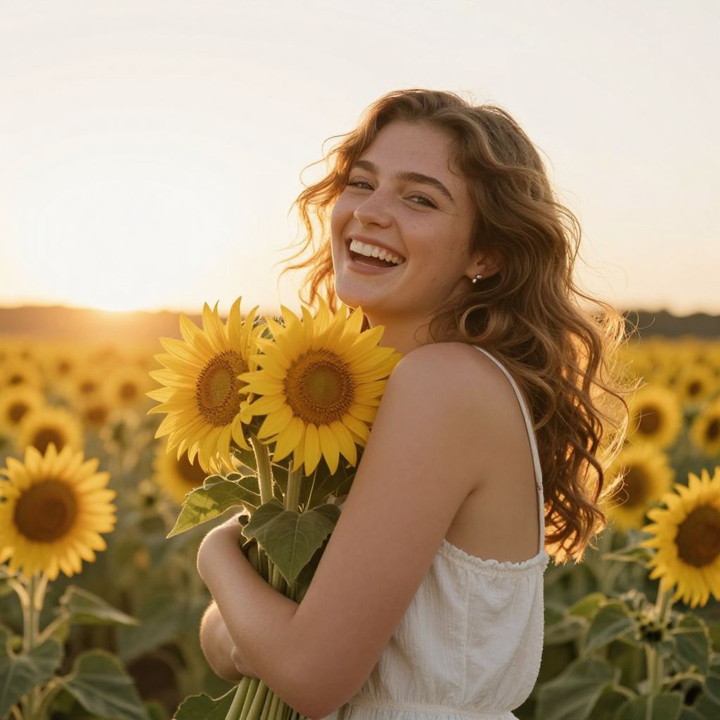 Radiant joy blooms like the sun-kissed flowers as a young woman embraces the warmth of summer, her laughter echoing the golden hues of a fleeting sunset, embodying the ephemeral beauty of freedom and hope.