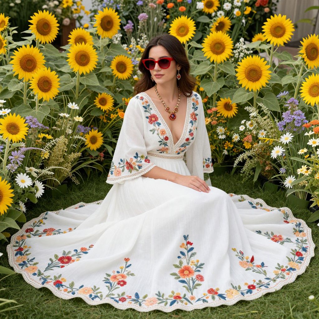 Elegantly seated amidst a vibrant floral backdrop, a woman dons a flowing white gown adorned with intricate floral embroidery, complemented by red sunglasses and matching jewelry, exuding a timeless charm against a lush tapestry of sunflowers and wild blooms.