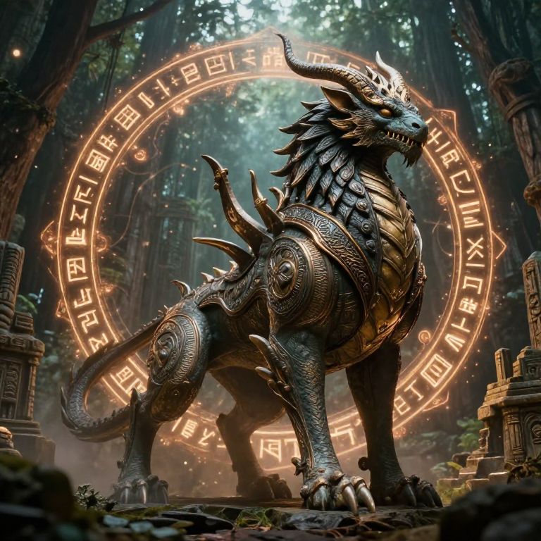 гѓ‡г‚јгѓ•гѓґгѓјг‚ёгѓ§гѓі depicted as an intricate fantasy creature, majestic and mythical, surrounded by glowing runes and ancient ruins, magical forest background, rich textures and depth, dramatic lighting highlighting its powerful presence.