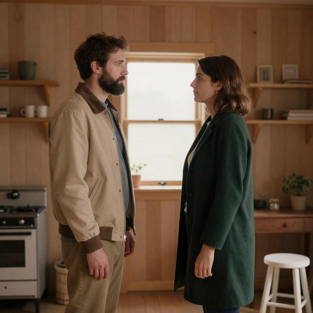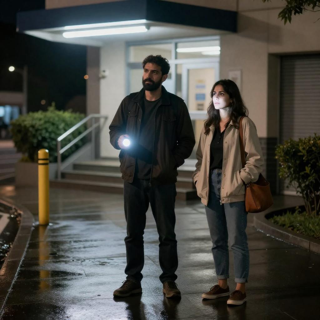 Photograph of a night scene. Two people standing on a wet, reflective sidewalk. Man on left, holding flashlight, dark jacket, jeans, beard, looking forward. Woman on right, light jacket, jeans, brown shoulder bag, looking slightly to the left. Overhead fluorescent lights, building entrance, stairs in background. Street, bushes, and a yellow bollard on left. Man's flashlight casts bright light on woman's face.