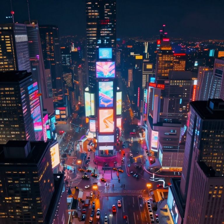 Aerial photograph of a vibrant, neon-lit cityscape at night, featuring colorful billboards, busy streets, and illuminated skyscrapers.