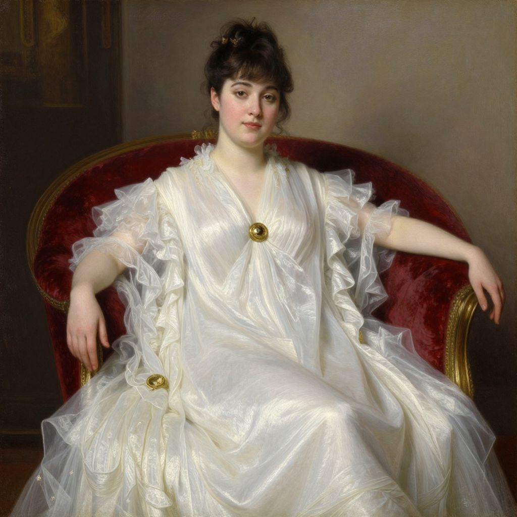 A finely detailed oil painting in the classical portraiture style, featuring a woman elegantly seated on a red velvet chair, adorned in a flowing white gown with ruffled sleeves and a gold brooch, exuding a vintage charm reminiscent of John Singer Sargent's masterful technique.