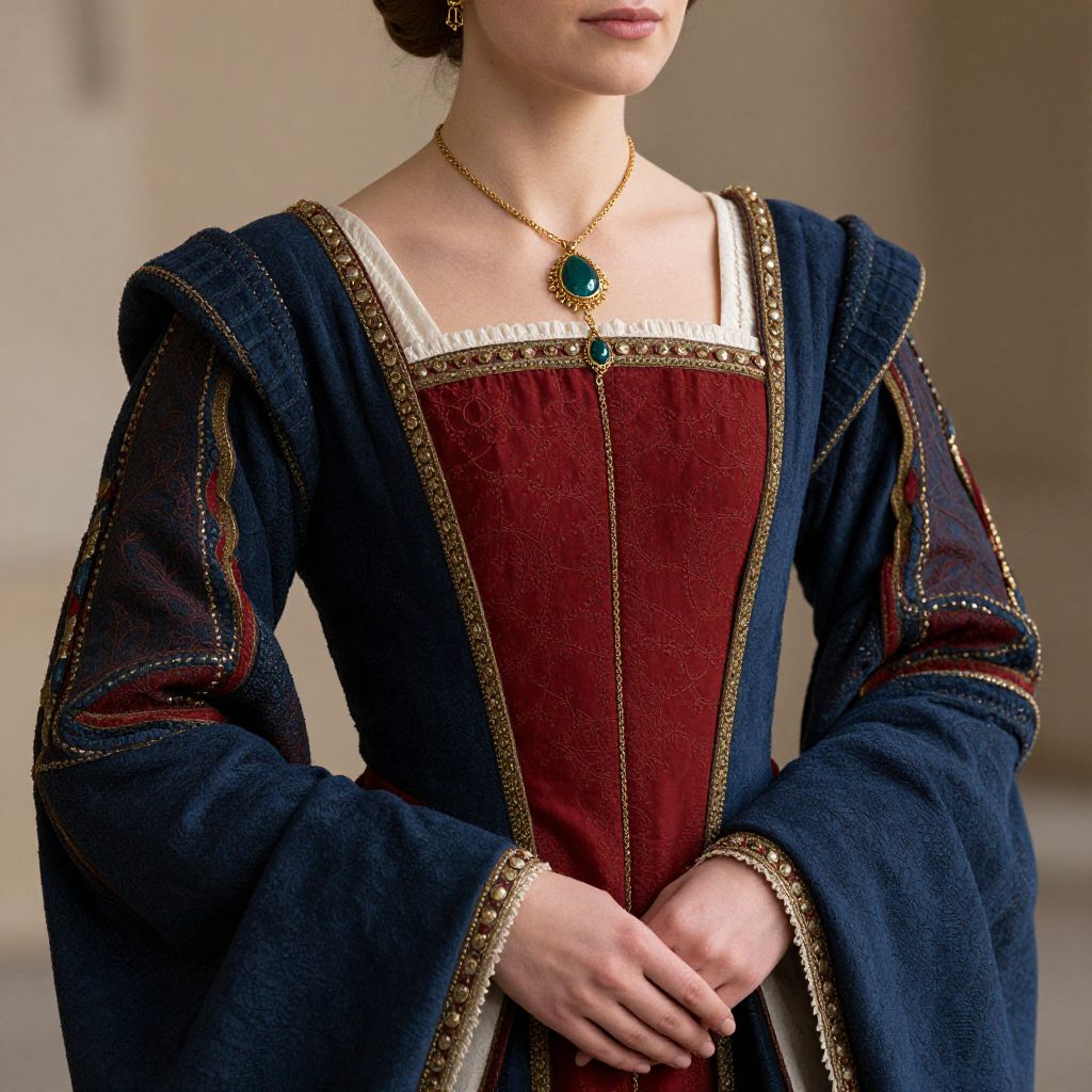Medieval royal costume, a close up of a woman in a blue and red dress