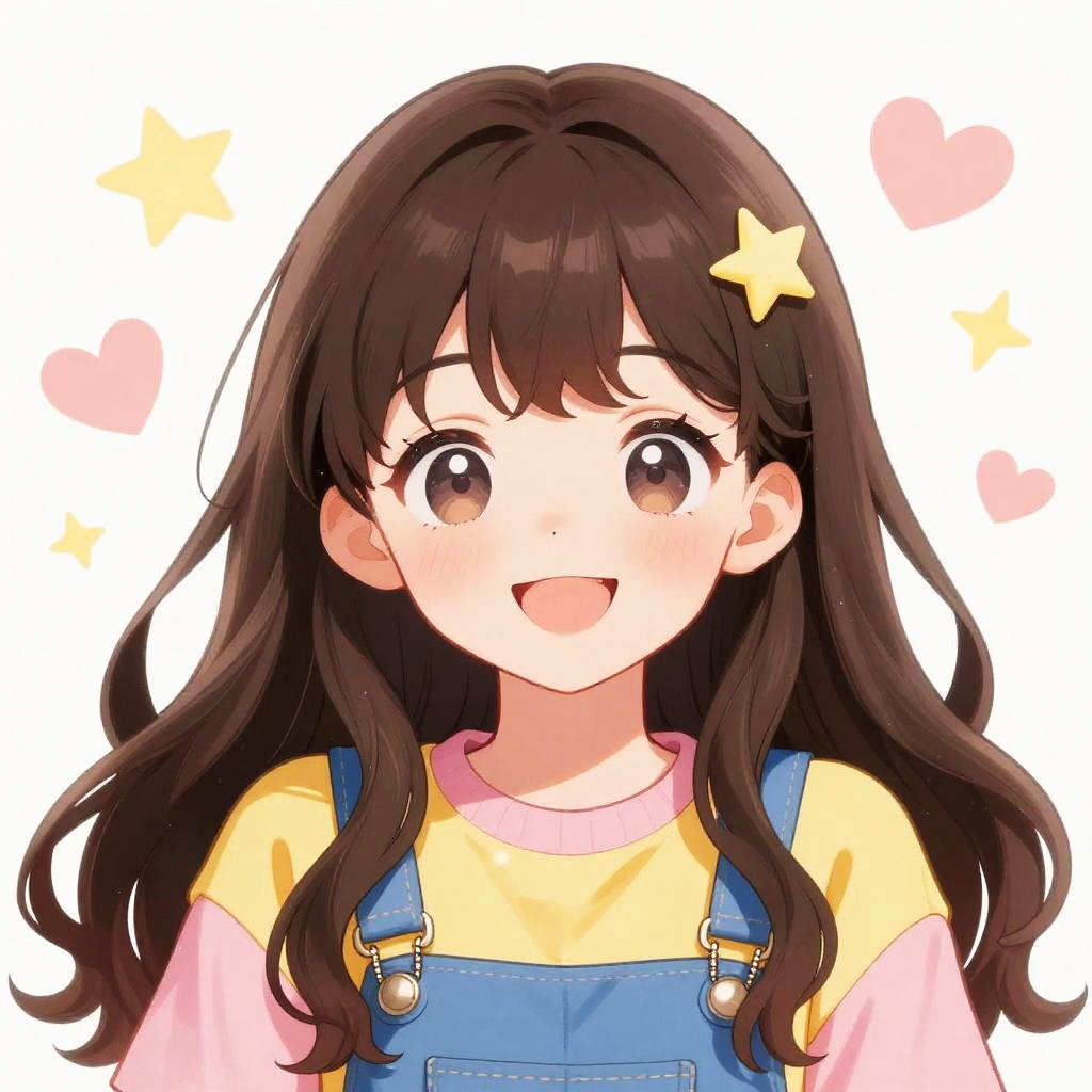 Anime-style digital drawing of a cute, smiling girl with long brown hair, yellow star hairclip, wearing blue overalls and yellow shirt, with pink
