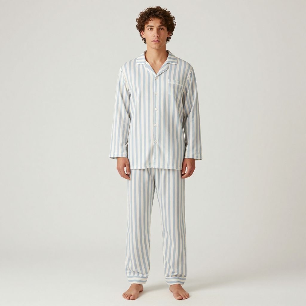 Photograph of a young man with curly brown hair and light skin standing against a plain white background. He wears matching white pajamas with vertical light blue stripes, featuring a long-sleeved button-up top and loose pants. He is barefoot, with his arms relaxed by his sides and a neutral expression on his face. The clean, minimalistic background emphasizes the subject, making the pajamas the focal point. The lighting is even, eliminating shadows and highlighting the crisp, clean texture of the fabric.