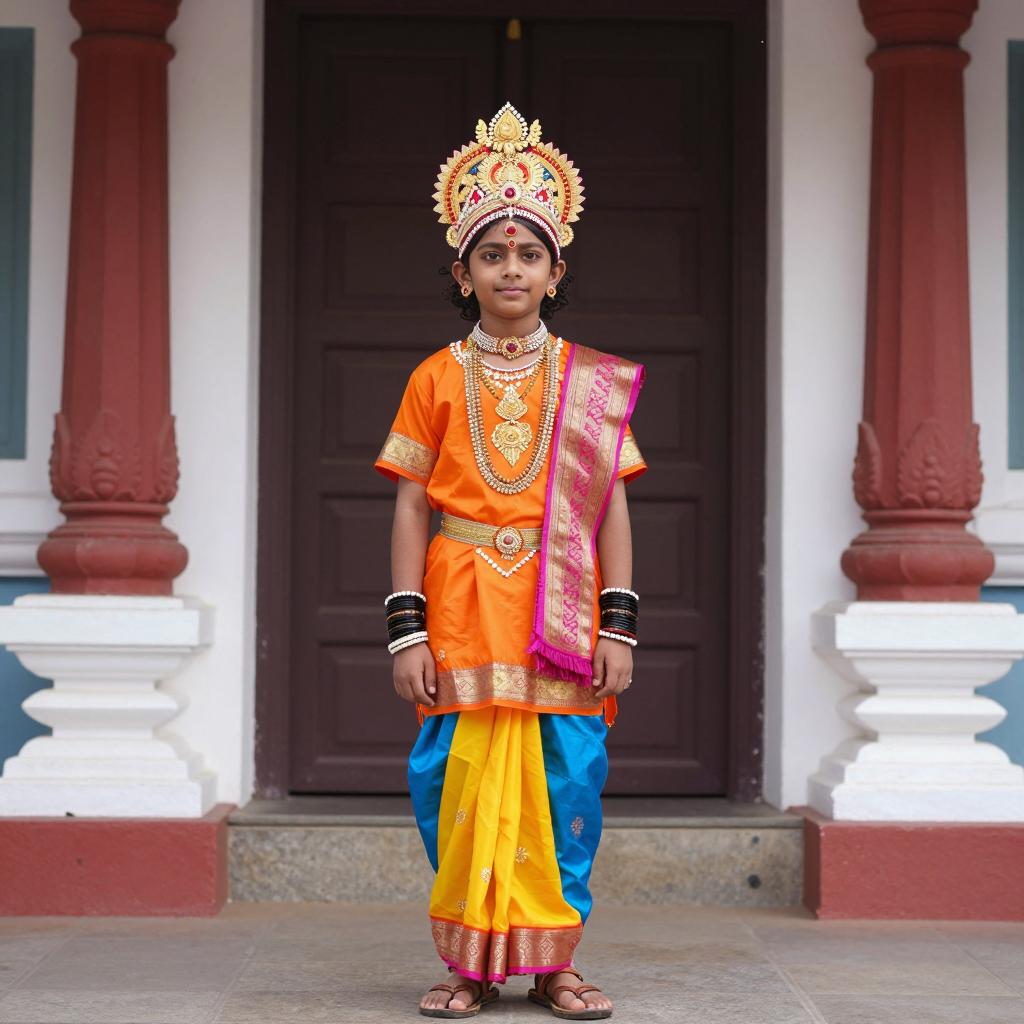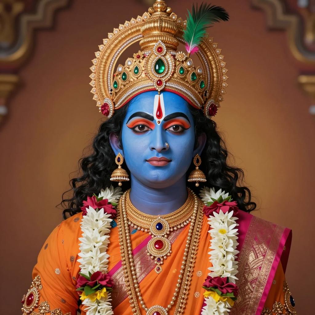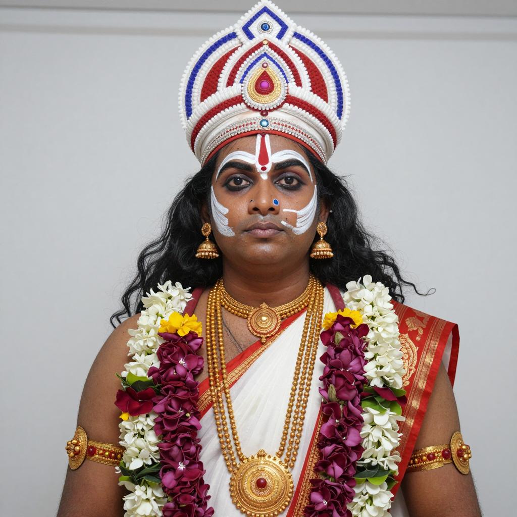 Krishna costume india, photograph of an Indian deity, male, medium brown skin, long black hair, wearing traditional Hindu ritual attire, red and white sari, ornate headpiece with central emblem, striped red and white colors, facial paint with white lines, necklace with large gold pendant, multiple beaded necklaces, garland of maroon and white flowers, armband with gold details, serious expression, plain white background, medium close-up, traditional Indian festival clothing, detailed jewelry, cultural ritual attire, realistic ure, traditional Indian art style