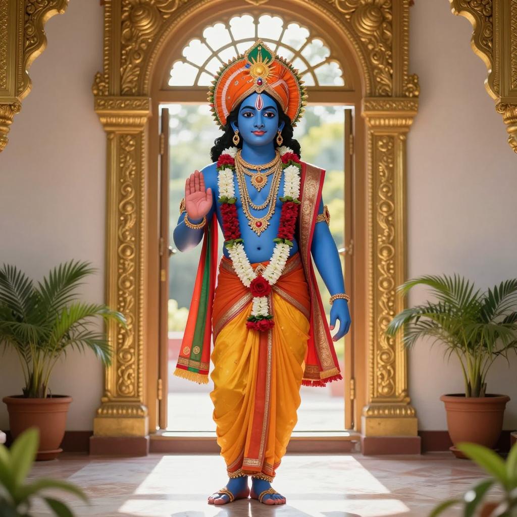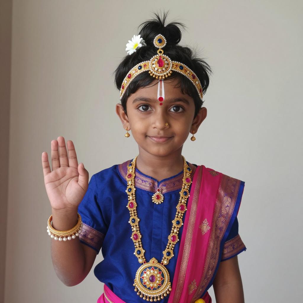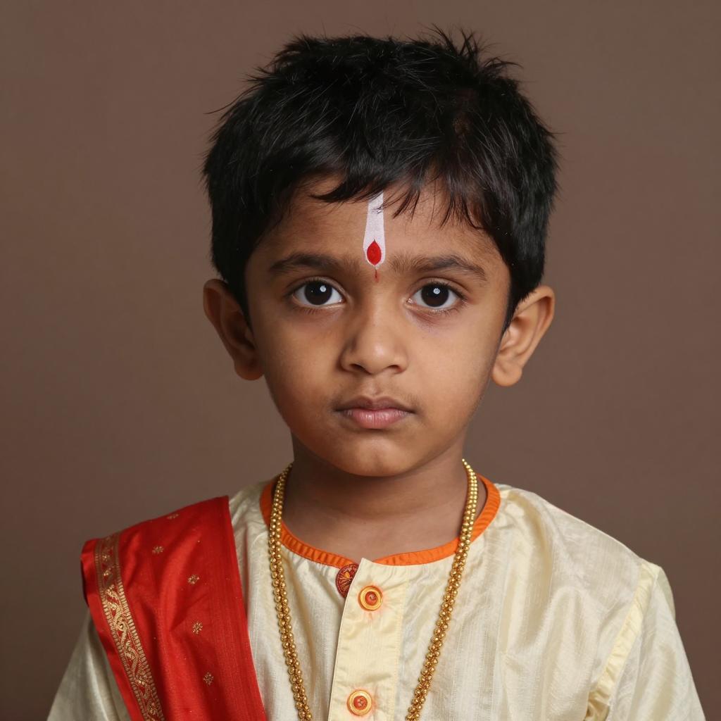 Krishna costume india, photograph of an Indian deity, male, medium brown skin, long black hair, wearing traditional Hindu ritual attire, red and white sari, ornate headpiece with central emblem, striped red and white colors, facial paint with white lines, necklace with large gold pendant, multiple beaded necklaces, garland of maroon and white flowers, armband with gold details, serious expression, plain white background, medium close-up, traditional Indian festival clothing, detailed jewelry, cultural ritual attire, realistic ure, traditional Indian art style