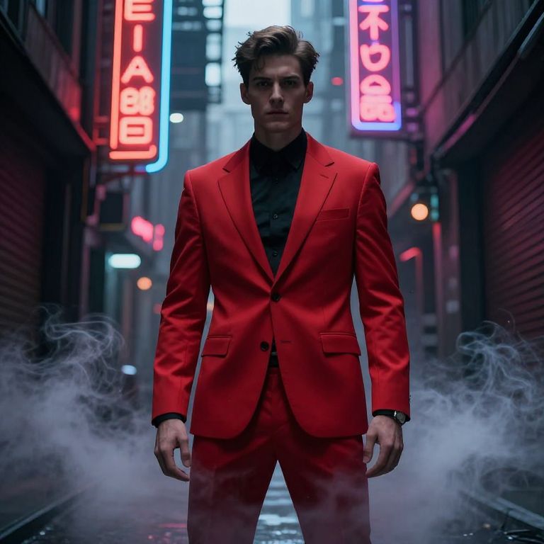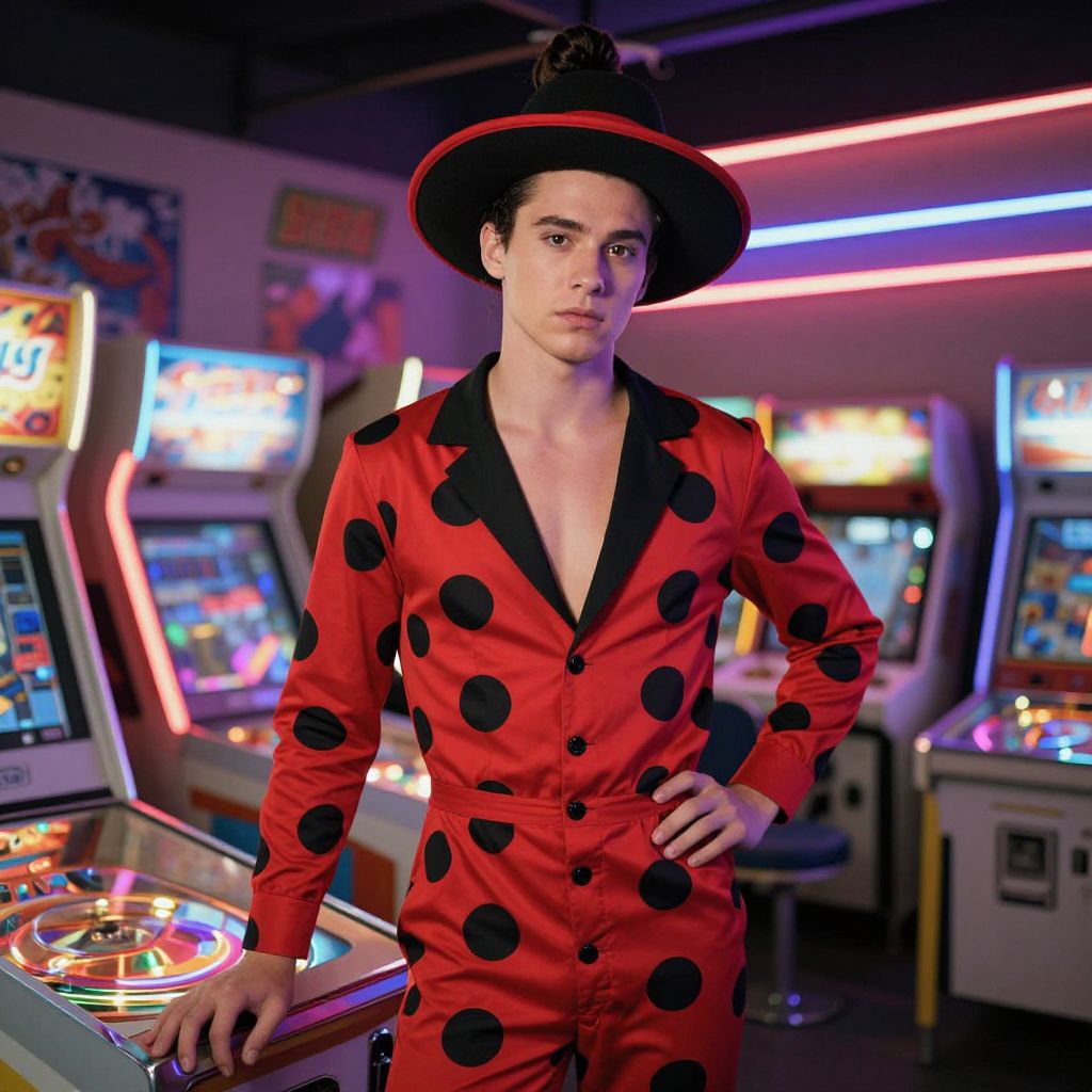 A young man with a manbun hairstyle stands confidently in a retro 1980s arcade costume, wearing a red and black polka-dot jumpsuit with a wide-brimmed hat, soft lighting from above casting subtle shadows on a neon-lit arcade interior with old pinball machines and glowing signs in the background.