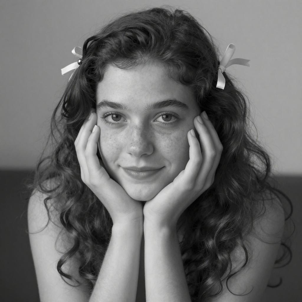 Black-and-white photograph of a young woman with wide, surprised eyes and open mouth, lying in dense pine needles. She has dark, slightly disheveled hair and wears a light-colored shirt. Pine needles fill the background.