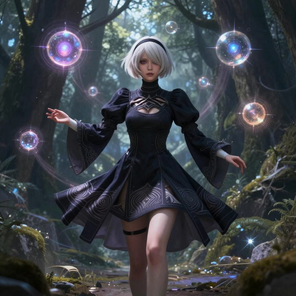 Nierah, an enigmatic sorceress in an ancient forest, surrounded by floating magical orbs and ethereal light beams, wearing flowing robes with intricate patterns, mystical atmosphere, fantasy art, vibrant colors and shadows.