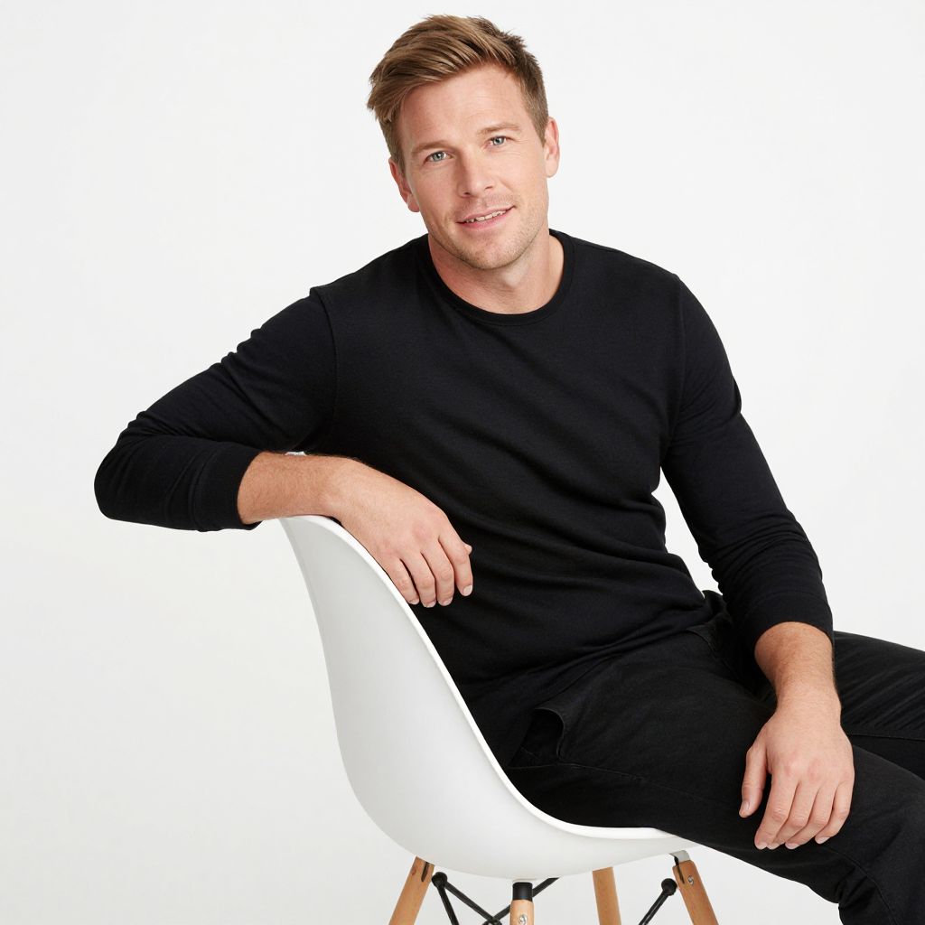 Photograph of a handsome Caucasian man with short, light brown hair and a slight smile. He's wearing a long-sleeve black shirt and is sitting on a white modern chair with wooden legs. His right arm rests on the chair's back while his left hand is on his knee. The background is plain white, making him the clear focus. The lighting is even, highlighting his clean, casual look.