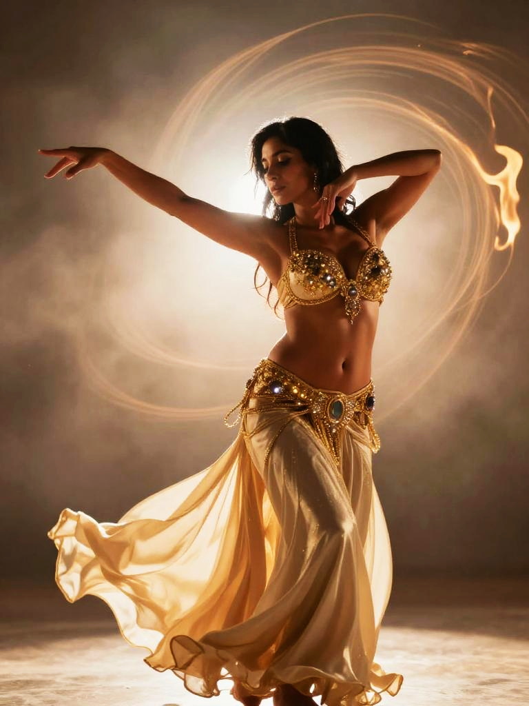 Belly dance, dynamic mid-motion shot of medium-brown-skinned woman with sleek black hair extending one arm forward and the other bent near her face, torso slightly twisted, jeweled bra top and hip scarf shimmering, wisps of fabric trailing from her costume, gold and ivory outfit glowing against a backdrop of swirling warm light, dramatic backlighting and haze, soft abstract flames of light, cinematic dance photography, crisp detail and motion