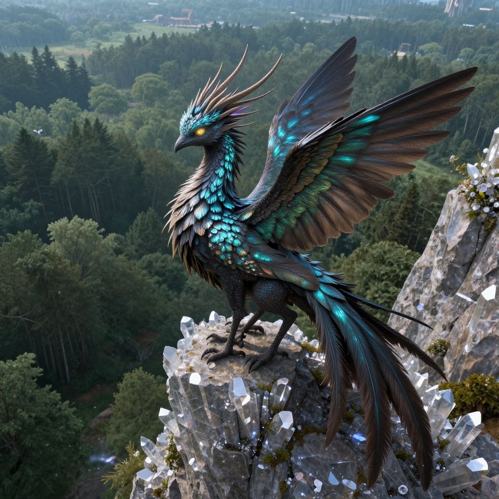 A digital fantasy artwork depicting a majestic dragon-like creature with iridescent blue and green feathers, sharp yellow eyes, and long, dark, feathered wings spread wide. It stands on a rocky, crystal-studded outcrop with white crystals, overlooking a dense, lush forest in the background. The creature's feathers have a metallic sheen, and its tail is long and feathery, with dark and light tips. The background features a misty, green forest extending to the horizon. The overall style is highly detailed and vibrant, with a blend of realism and fantasy elements.