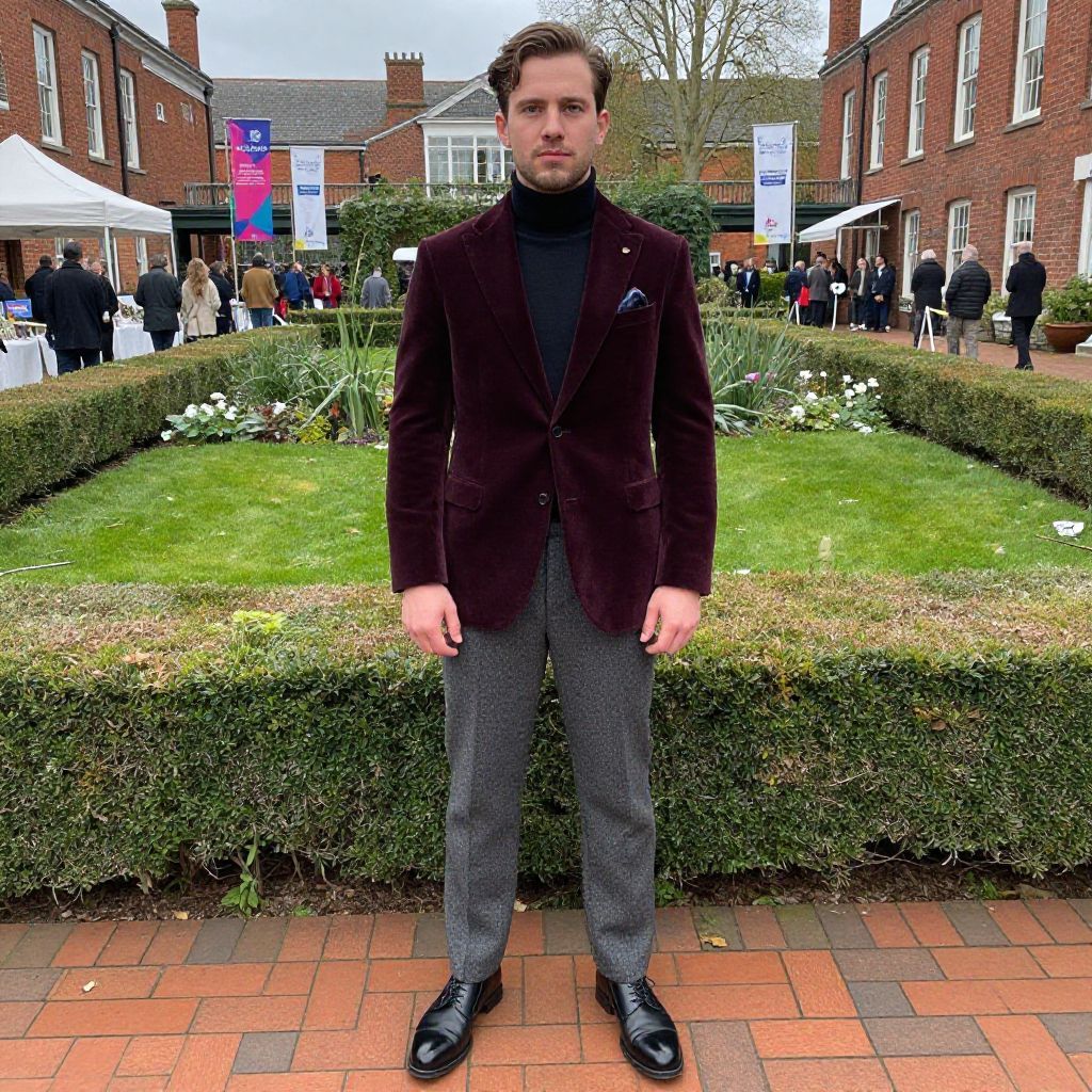 A man, burgundy velvet blazer, black turtleneck sweater, gray wool trousers, classic black derby shoes, understated pocket square, historic brick architecture, lush green gardens, community event banners, overhead shot, confident expression. Man has masculine face and piercing eyes