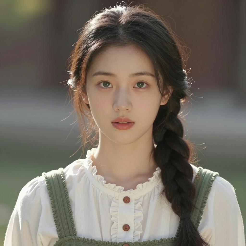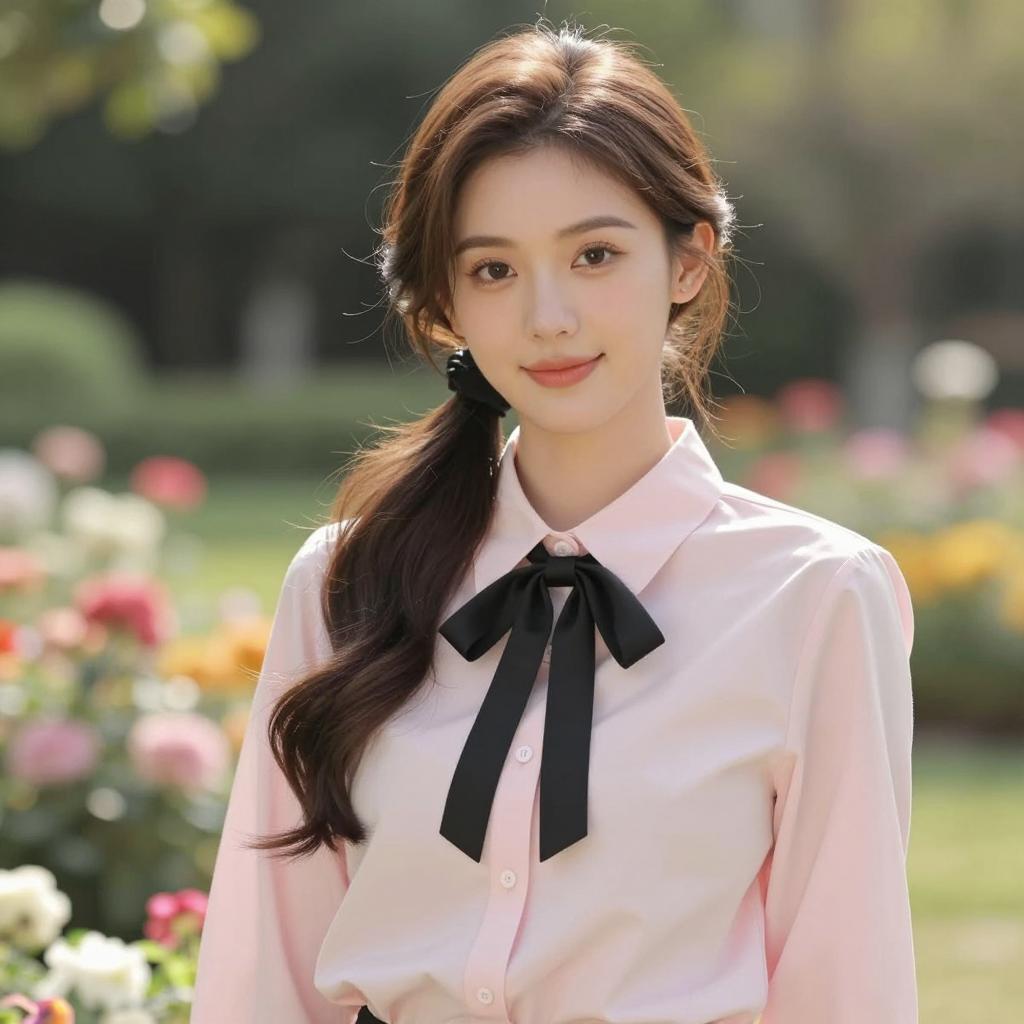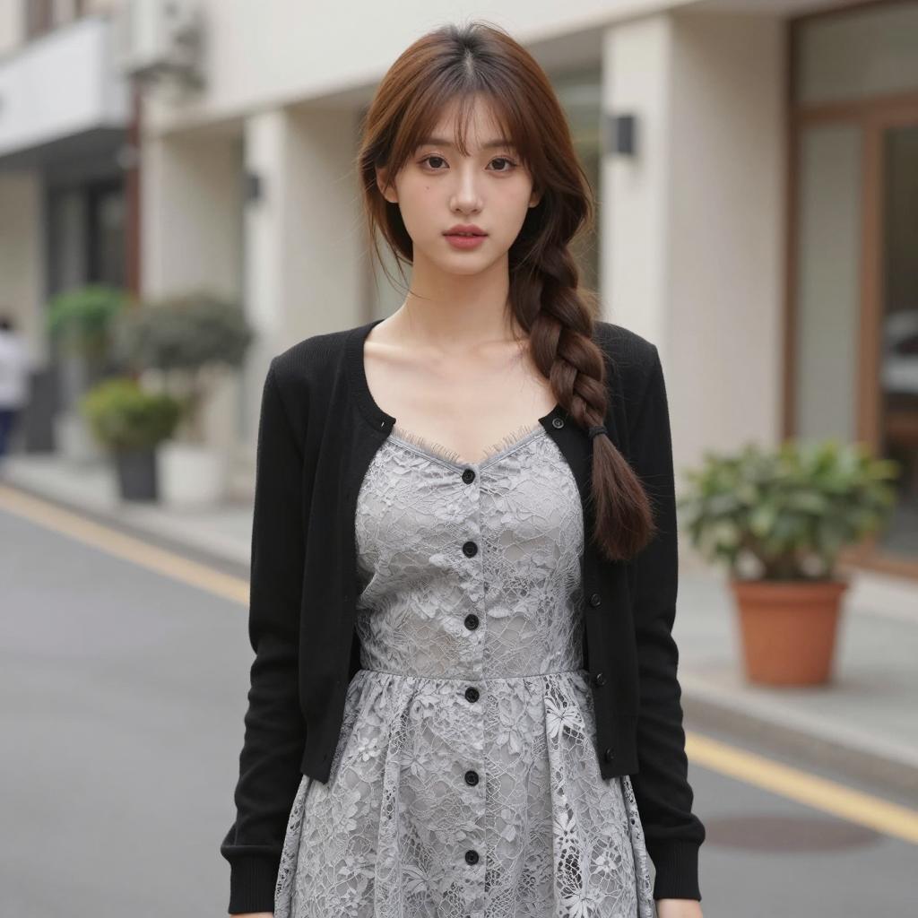 Photorealistic portrait of a young East Asian woman standing outdoors during daytime. She has long brown hair tied in a ponytail and is wearing a brown cardigan over a white blouse with a black ribbon bow. The background is slightly blurred, featuring buildings and trees under a clear sky, with soft natural light highlighting her neutral expression and casual attire.