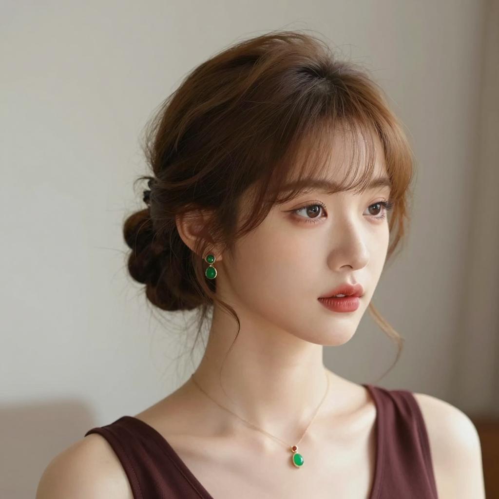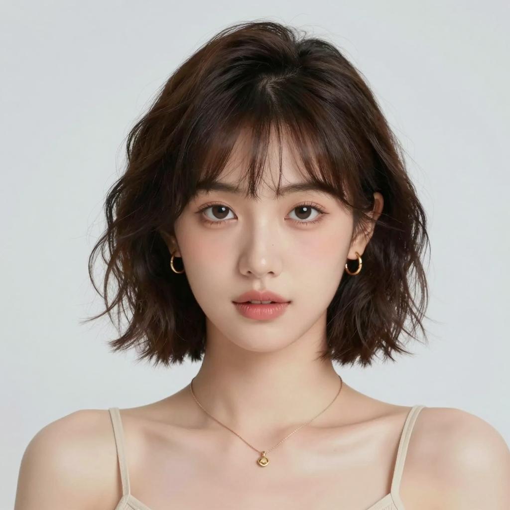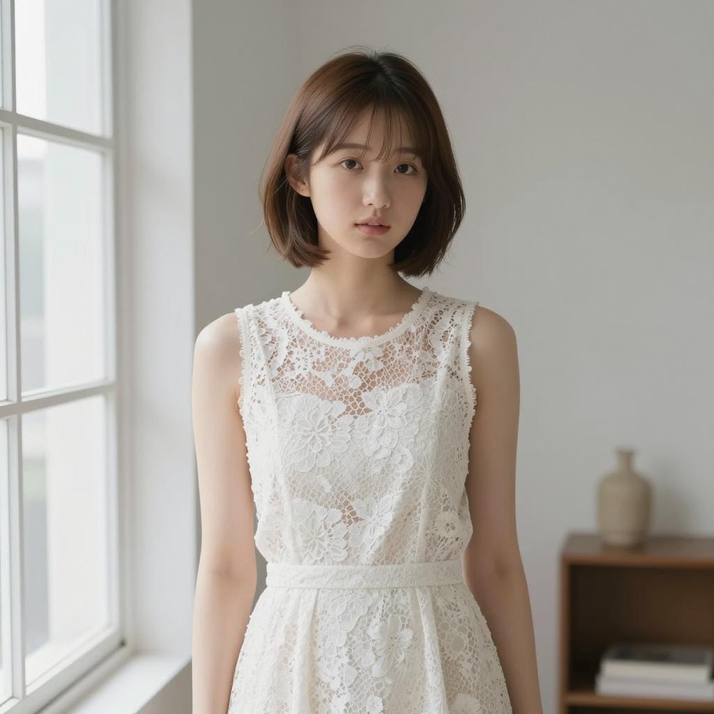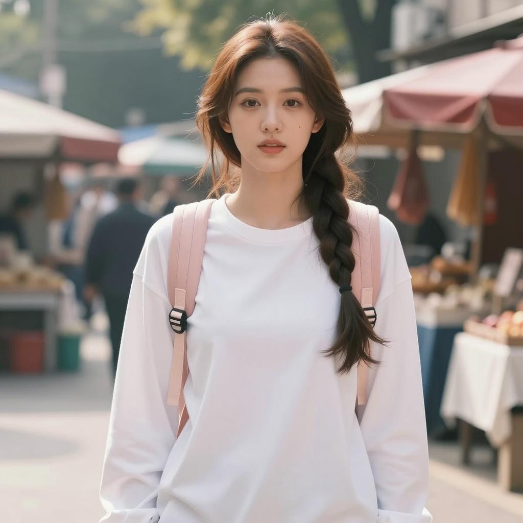 Photorealistic portrait of a young East Asian woman standing outdoors during daytime. She has long brown hair tied in a ponytail and is wearing a brown cardigan over a white blouse with a black ribbon bow. The background is slightly blurred, featuring buildings and trees under a clear sky, with soft natural light highlighting her neutral expression and casual attire.