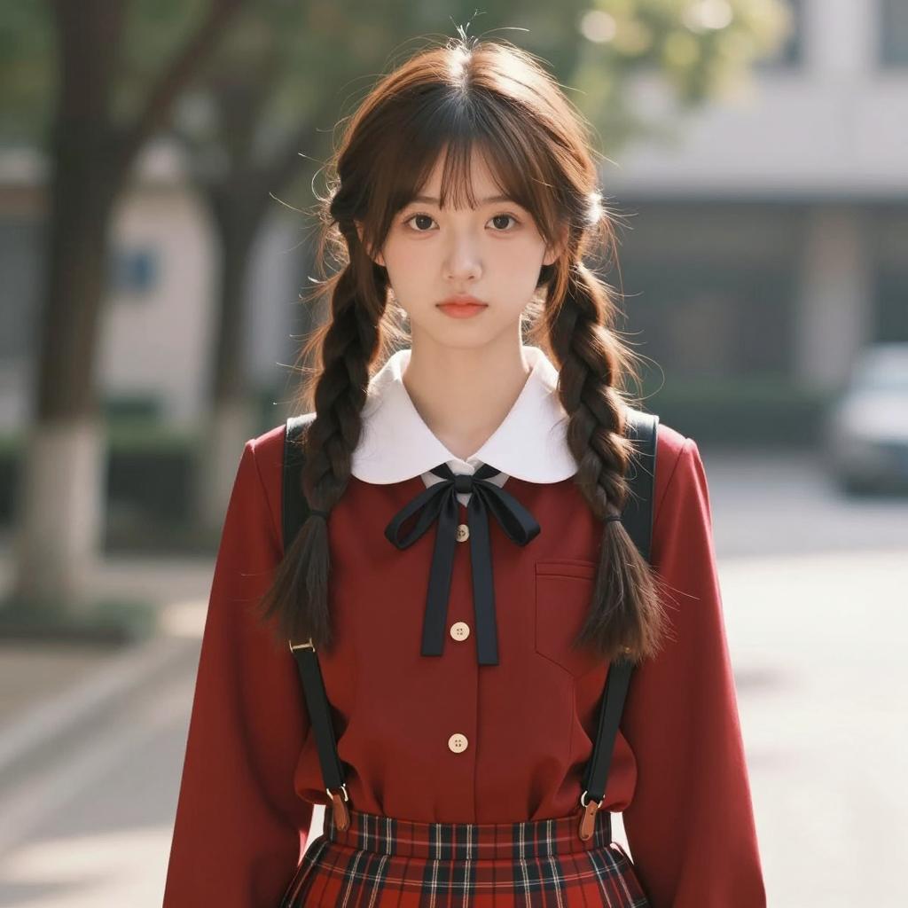 Woman code clothing costume, photorealistic portrait of a young woman, anime-style, standing outdoors, daytime, clear sky, brown cardigan, white blouse with black ribbon, long brown hair in ponytail, neutral expression, slightly blurred background with buildings and trees, soft light, detailed ures, realistic shadows, casual attire, high-quality, photorealism, T2I-generated, natural colors, realistic depth of field