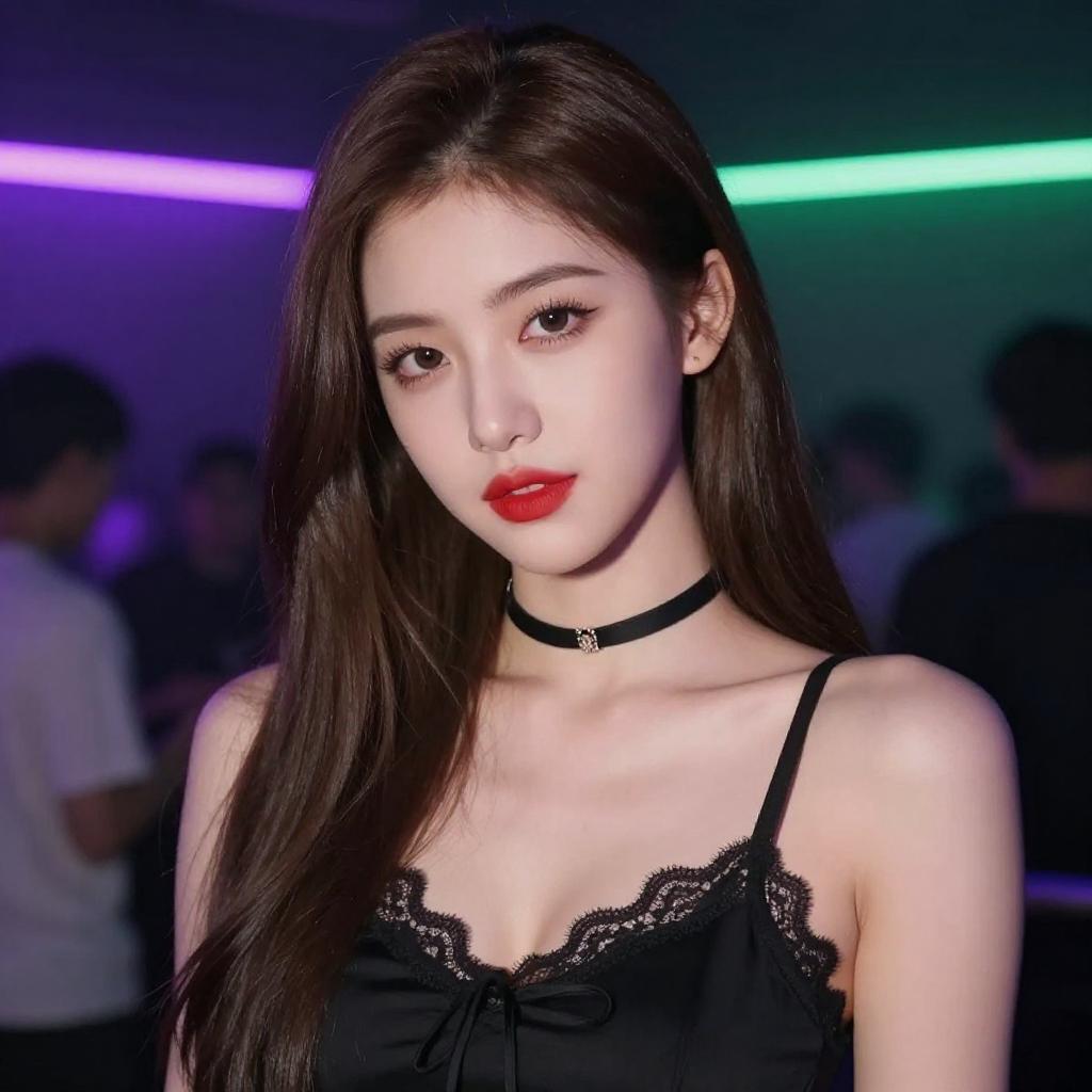 Photograph of a young woman with long, straight brown hair and fair skin. She's wearing a black, lace-trimmed tank top and a black choker necklace. Her bright red lipstick stands out against her pale complexion. The background is dimly lit with neon purple and green lights, giving a club-like atmosphere. She's looking directly at the camera with a slight smile.