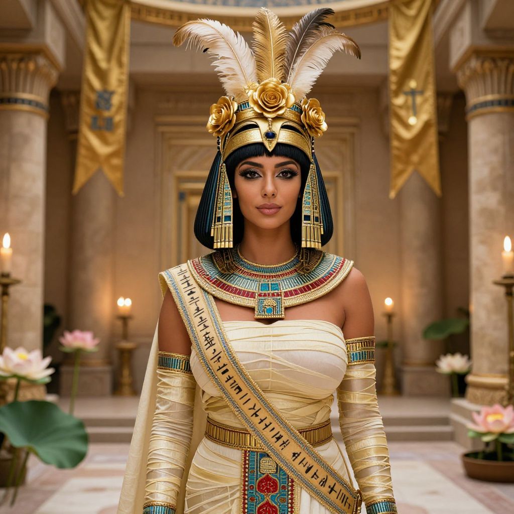 A vibrant, high-resolution image of a well-dressed woman in a mummy princess costume, with a large, intricate headpiece that combines a mummy mask with a crown of gold feathers and roses, a long wraparound gown featuring red and blue embroidery, and a sash with tiny hieroglyphs. She has a striking face with high cheekbones, dark brown eyes, and a confident, regal expression. The scene takes place in a candlelit palace with stone pillars, lotus flowers, and golden banners fluttering in a gentle breeze.. The woman has big tits and cute face