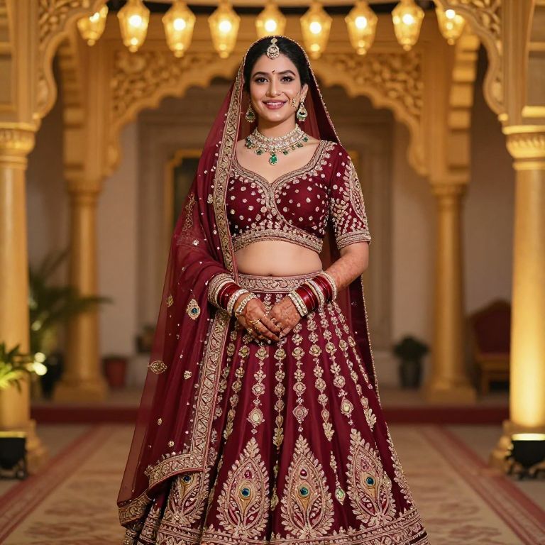 Photograph of an Indian bride in a maroon, gold-embroidered lehenga and dupatta, standing in an ornate, golden-