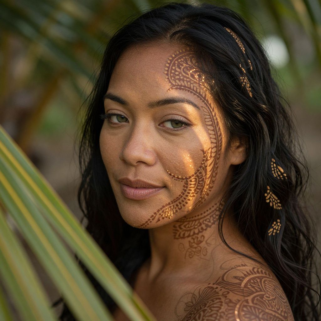 Mesmerizing portrait of a Micronesian woman with soft green eyes and raven hair adorned with intricate henna patterns shimmering under soft golden light filtering through palm fronds. Her expression shifts from introspective to gentle smile as she glances downward, revealing emotional depth beneath tranquil exterior. Captured from unconventional perspective slightly above and behind subject, interplay of shadows and light highlights face while focusing on intricate skin etchings. This fusion of realism and artistic expression transports viewer to serene, sun-drenched moment.