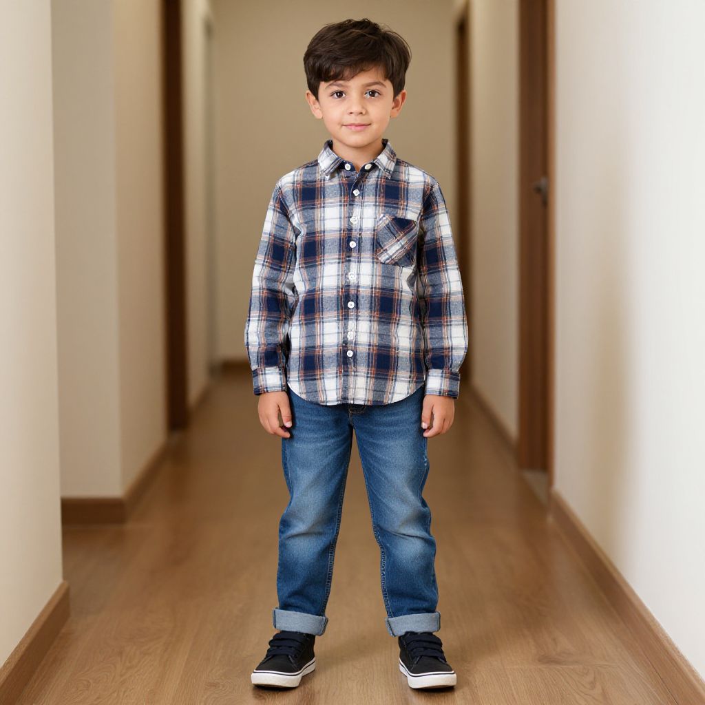 Photograph of a young boy standing in a narrow, wooden-floored hallway with white walls and dark brown doors. He has short, dark brown hair and a light brown skin tone, likely of Hispanic or Asian descent. He wears a blue, white, and black plaid long-sleeve shirt, blue jeans with the cuffs rolled up, and black sneakers with white soles. His expression is neutral, and he stands with his arms relaxed by his sides. The hallway recedes into the background, creating a sense of depth. The lighting is even, highlighting the boy's attire and the hallway's simplicity.